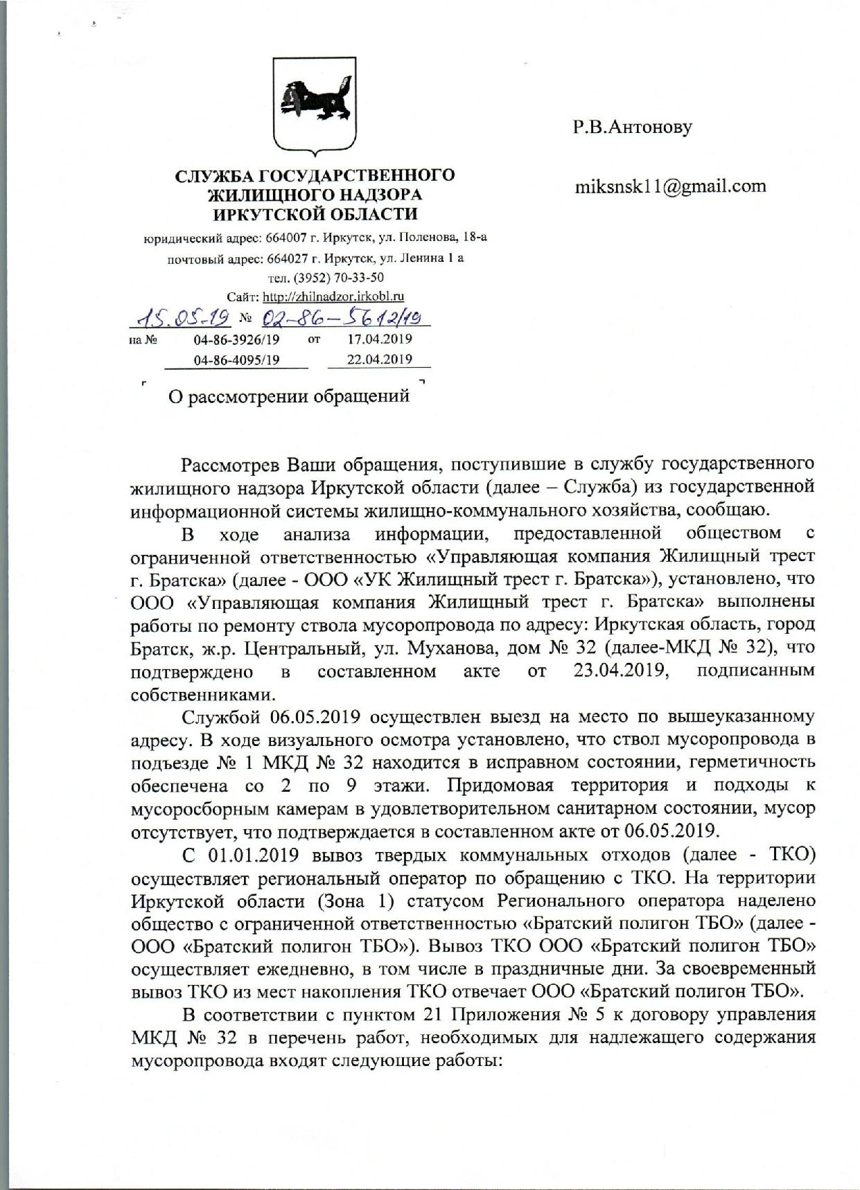 Номер жалобы:53265 Тип жалобы:Иные проблемы ЖКХ Название объекта: Регион:Иркутская область Город:Братск Адрес:улица Муханова, 32 Описание жалобы:Разрушен мусоропровод Статус: