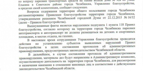 Номер жалобы:53240 Тип жалобы:Иные проблемы ЖКХ Название объекта: Город:Челябинск Адрес:Челябинск, улица Елькина, 94 Описание жалобы:Парковка на газоне Статус: