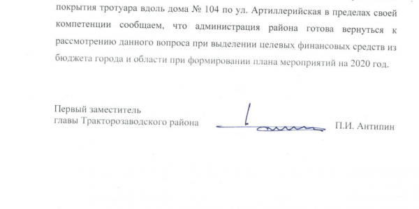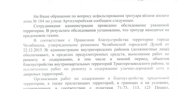 Номер жалобы:53347 Тип жалобы:Иные проблемы ЖКХ Название объекта: Регион:Челябинская область Город:Челябинск Адрес:Артиллерийская улица, 104 Описание жалобы:743-5 Около магазина рыбы по адресу г. Челябинск, ул. Артиллерийская, д. 104 с торца находится небольшой участок дорожки, который никак не могут заасфальтировать. По камням ходить невыносимо. Для открытия магазина начали делать и так всё и оставили.кому именно относится этот участок не могу сказать. Возможно это полномочия города, возможно вопрос к владельцам магазина. Но привести в порядок это нужно Статус: