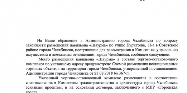 Номер жалобы:60963 Тип жалобы:Прочее Название объекта:Администрация Советского района Регион:Челябинская область Город:Челябинск Адрес:улица Курчатова, 11а Описание жалобы:Прошу проверить законность установки киоска, если киоск незаконный - демонтировать. Статус: