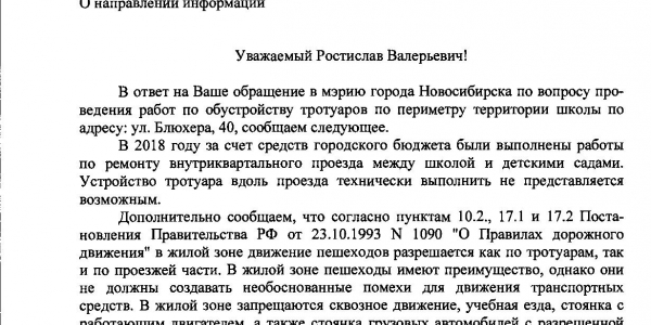 Номер жалобы:60982 Тип жалобы:Прочее Название объекта: Регион:Новосибирская область Город:Новосибирск Адрес:улица Блюхера, 40 Описание жалобы:Нет тротура вдоль всего периметра школы, так же рядом детский сад. Ходит много детей, и так же ездит много машин, большая вероятность несчастного случая. Статус: