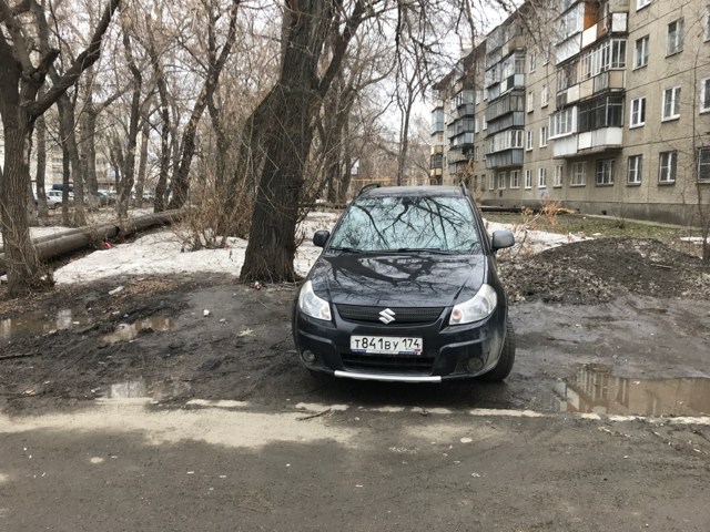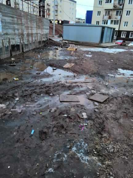 В этом же дворе, возле дома 8, отсутствует асфальтовое покрытие (с западной и южной стороны дома), сплошные грязь и огромные лужи. При сдаче данного дома сэкономили на дорожном полотне и часть прилигающей территории отсыпали мелким щебнем.