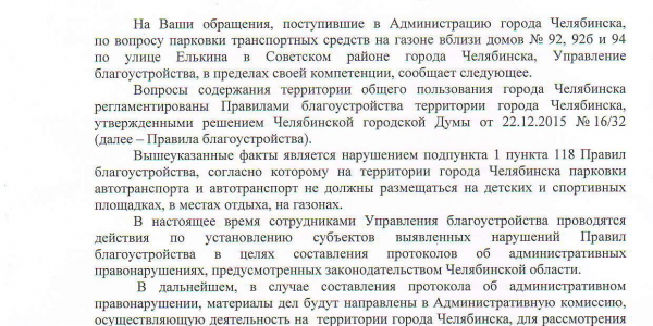 Номер жалобы:52871 Тип жалобы:Иные проблемы ЖКХ Название объекта: Регион:Челябинская область Город:Челябинск Адрес:улица Елькина, 92 Описание жалобы:Парковка на газоне. Статус: