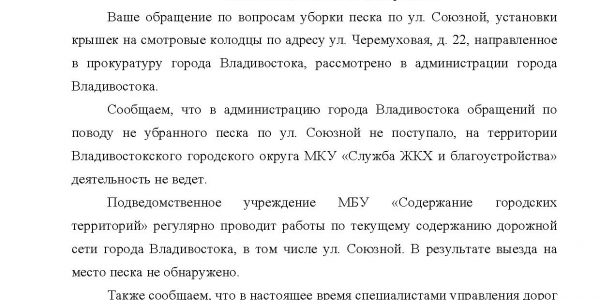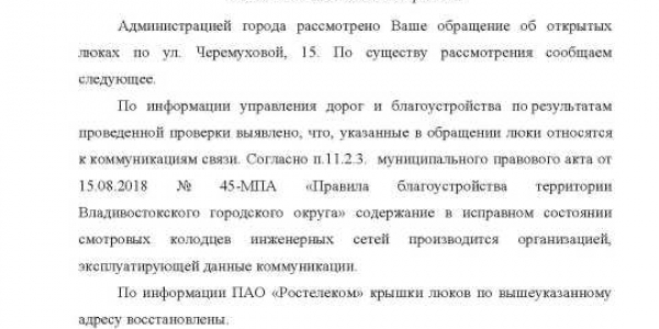 Номер жалобы:52841 Тип жалобы:Иные проблемы ЖКХ Название объекта: Регион:Приморский край Город:Владивосток Адрес:Черёмуховая улица, 22 Описание жалобы:Открытые колодцы, напротив ТЦ Черёмушки, по прежнему ждут своих жертв. Статус: