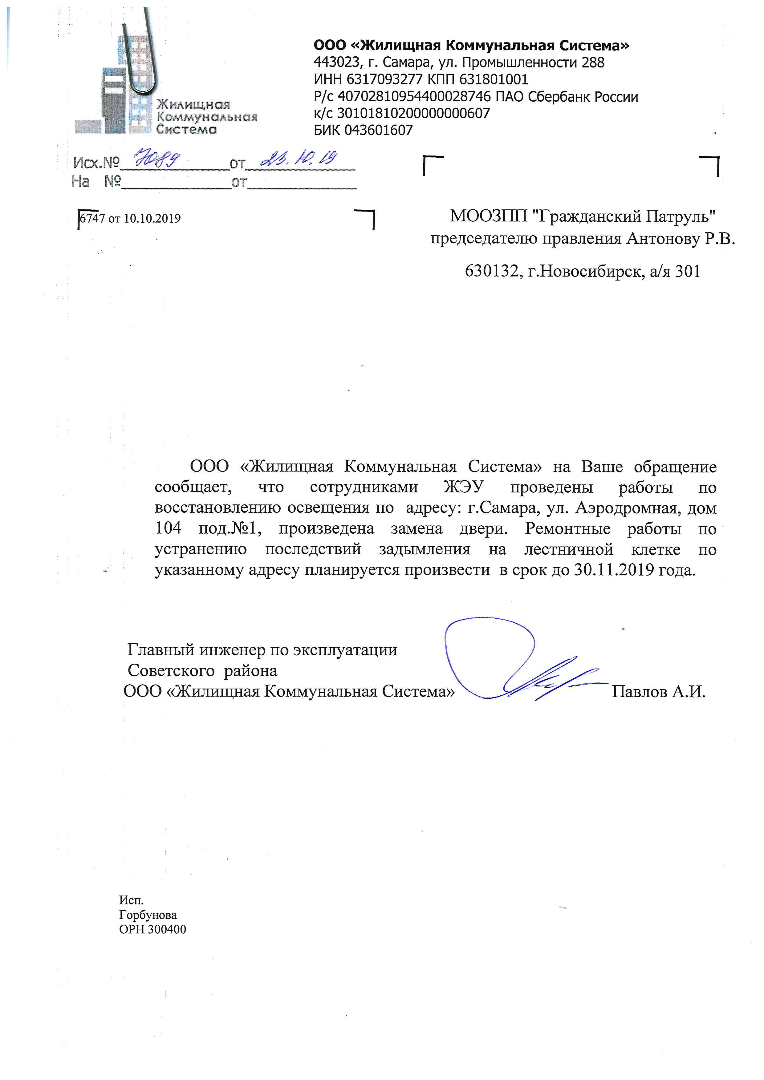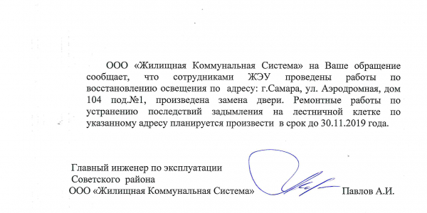 Номер жалобы:60810 Тип жалобы:Прочее Название объекта: Регион:Самарская область Город:Самара Адрес:Аэродромная улица, 104 Описание жалобы:Прошу взять на контроль жилищной инспекции и прокуратуры ситуацию с пожаром (выгоранием) электрического щита) на лестничной клетке 3 этажа дома 104 по ул. Аэродромной. Пожар произошел 30.09.19. С тех пор света в квартирах 1 подъезда нет. Подготовительных, демонтажных, ремонтных работ УК жкс не осуществляет, ссылаясь на влажность после тушения пожара. Замена, обслуживание электропроводки не осуществлялась с момента постройки дома Статус: