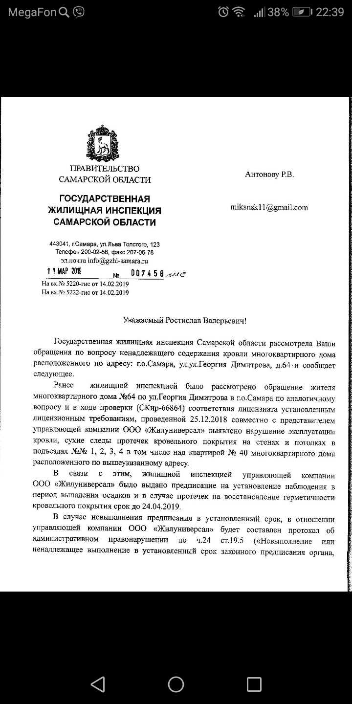 Номер жалобы:52509 Тип жалобы:Иные проблемы ЖКХ Название объекта: Регион:Самарская область Город:Самара Адрес:улица Георгия Димитрова, 64 Описание жалобы:Течь крыши!! В документе вы указываете что сухие потёки, хотя у меня никогда не были, у меня сырые стены, в квартире когда на улице теплеет стоят лужи!! Как же вы состовляете документ!! Просто фото не могу больше добавить!! дополнительная информация вк самара Юлия Гаврилова (латиницей) Статус: