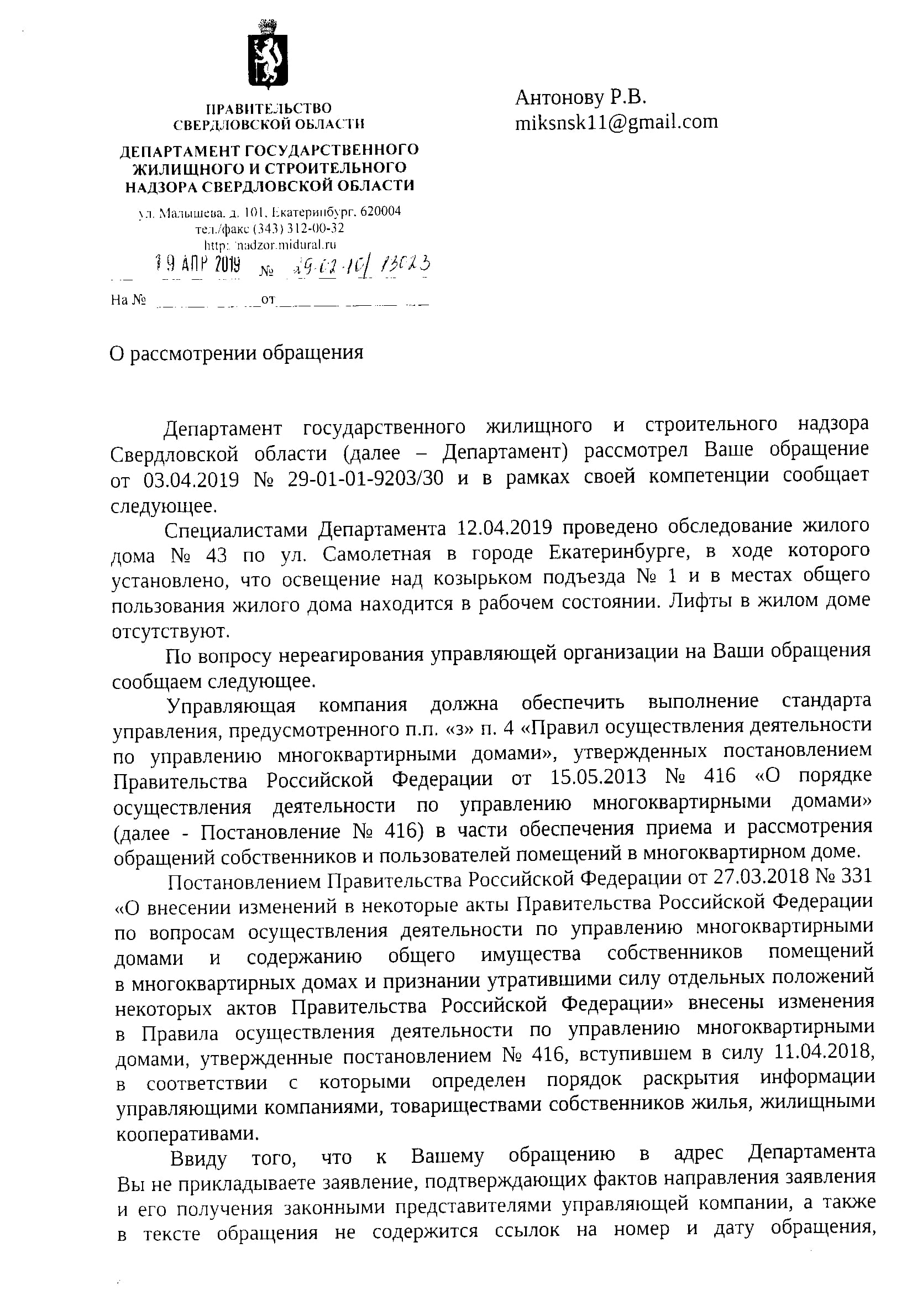 Номер жалобы:52525 Тип жалобы:Иные проблемы ЖКХ Название объекта: Регион:Свердловская область Город:Екатеринбург Адрес:Самолётная улица, 43 Описание жалобы:Нет фонаря над козырьком, просьба установить. 1 подъезд, Самолетная 43 Статус:
