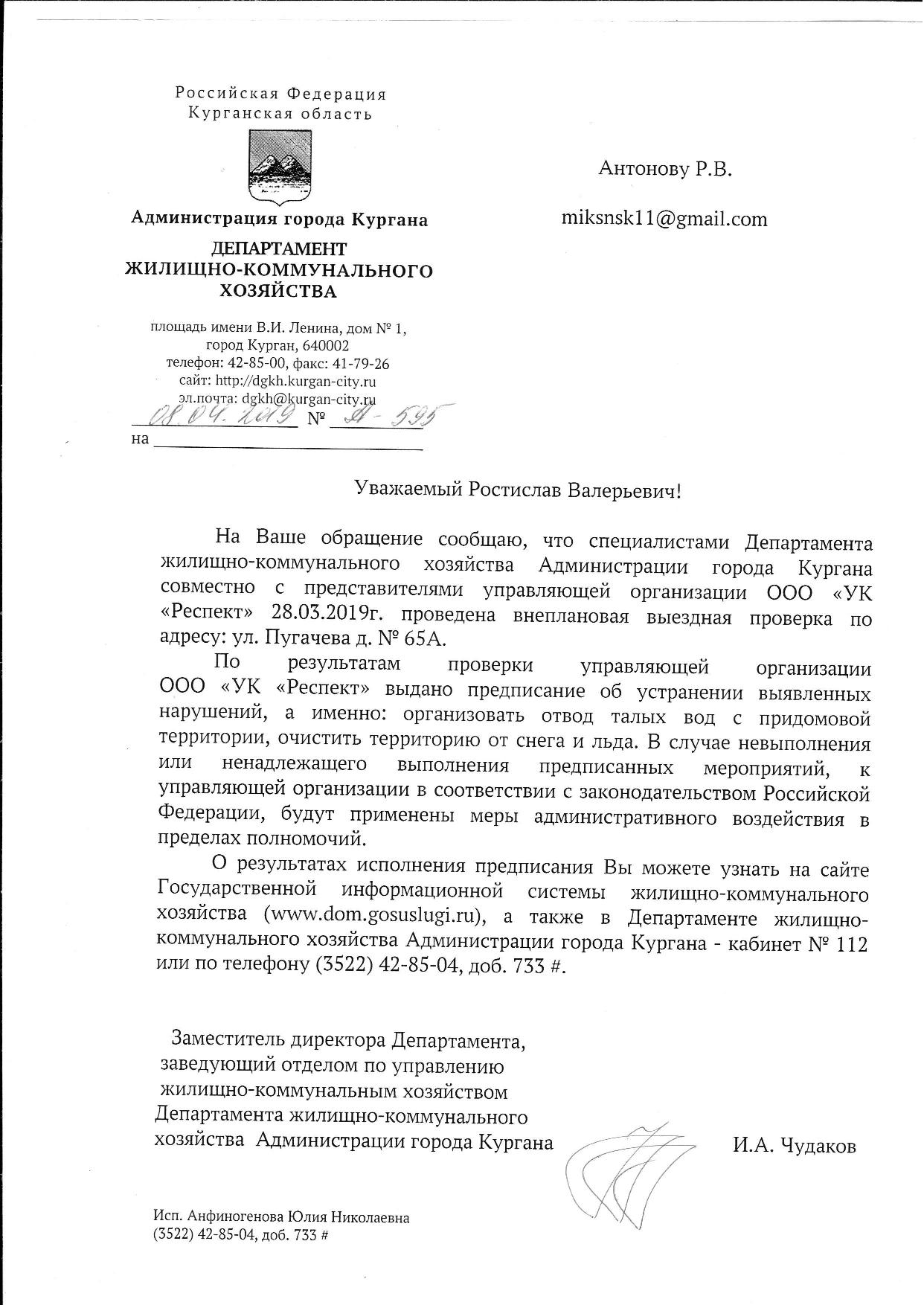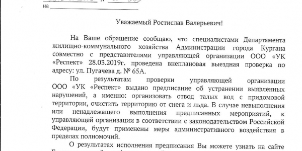 Номер жалобы:52648 Тип жалобы:Иные проблемы ЖКХ Название объекта: Регион:Курганская область Город:Курган Адрес:улица Пугачёва, 65А Описание жалобы:Во дворе дома стоит вода,жильцам не пройти к подъезду.Снег за всю зиму не убирали.УК Респект Статус: