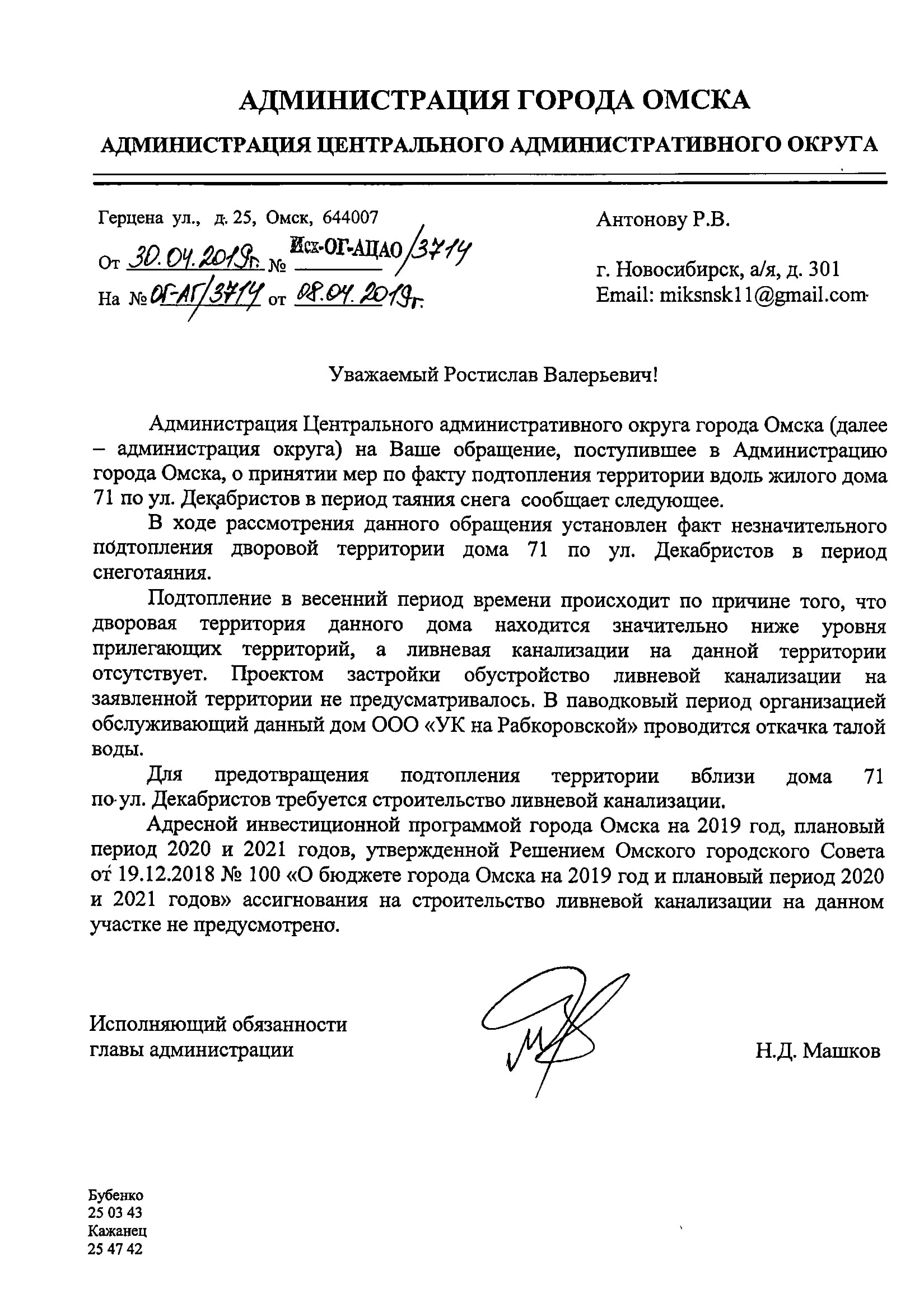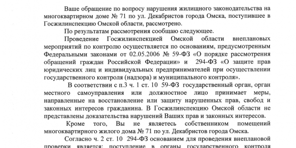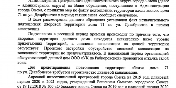 Номер жалобы:52696 Тип жалобы:Иные проблемы ЖКХ Название объекта: Регион:Омская область Город:Омск Адрес:улица Декабристов, 71 Описание жалобы:Уважаемый, Гражданский патруль. На вас одна надежда. Каждый год повторяется одно и тоже. В доль дома по улице Декабристов 71 не пройти. Ни пешком, ни с коляской. На все вопросы к старшему по дому одни отмашки. Звоники в Жилищник 6 тоже ни к чему не привели. На просьбу прислать машину и хотя бы пару раз откачать воду, сказано было, что такой машины нет Статус: