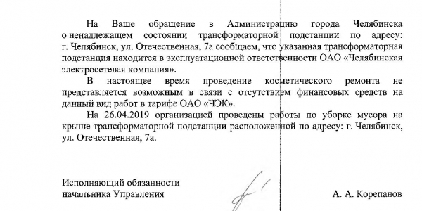 Номер жалобы:52643 Тип жалобы:Иные проблемы ЖКХ Название объекта: Регион:Челябинская область Город:Челябинск Адрес:Отечественная улица, 7А Описание жалобы:Необходимо провести покраску электрощитовой (фото 1) напротив дома 7А по улице Отечественная в соответствии с нормами, убрать многочисленный мусор с крыши сооружения. На момент написания данной жалобы электрощитовая находится в неудовлетворительном состоянии, портит вид дворового пространства, мусор на её крыше виден из окон близлежащих домов. Статус: