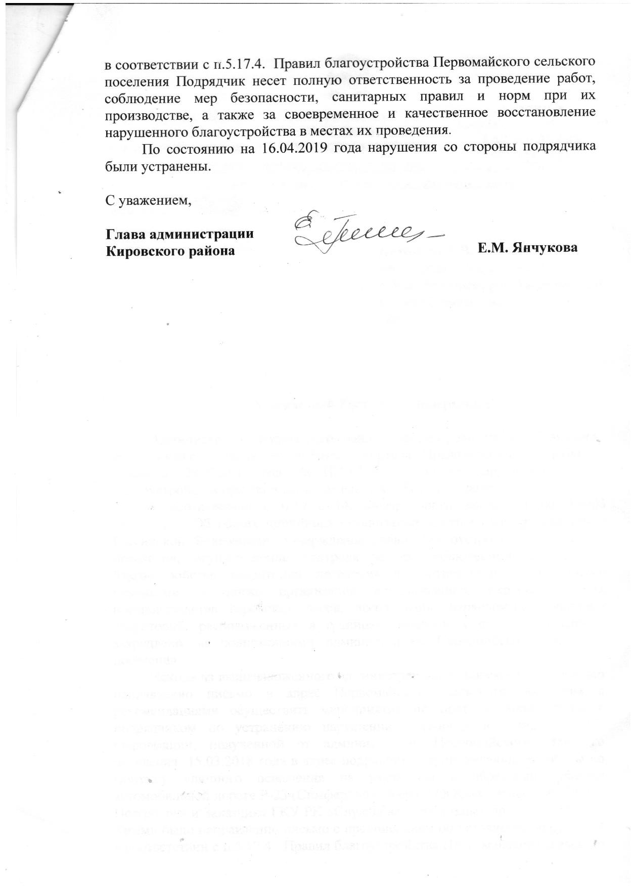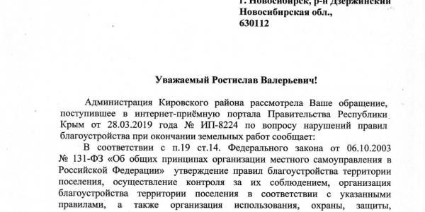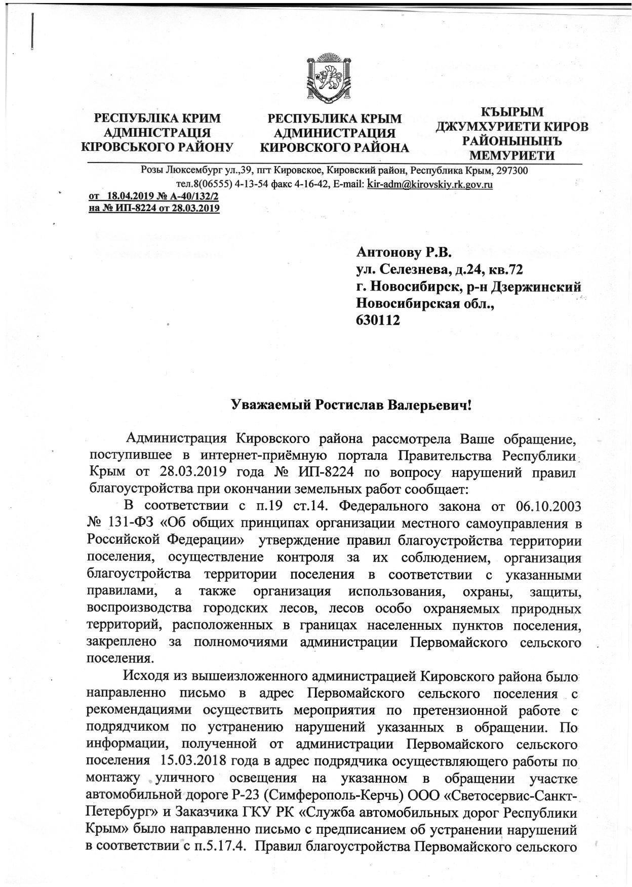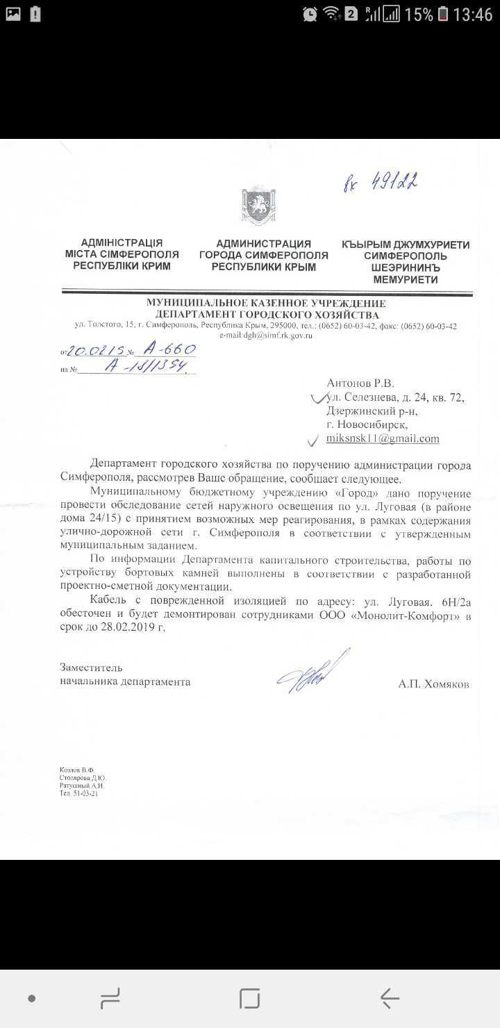 В ответ на письмо администрации Симферопыля от 20.02.19 исх. номер А-660, сообщаю, что высоковольтный кабель под напряжением на газоне во дворе жилого дома, с поврежденной изоляцией, вблизи детской площадки,так и не убран на 25.03.2019, прошу убрать. Статус: