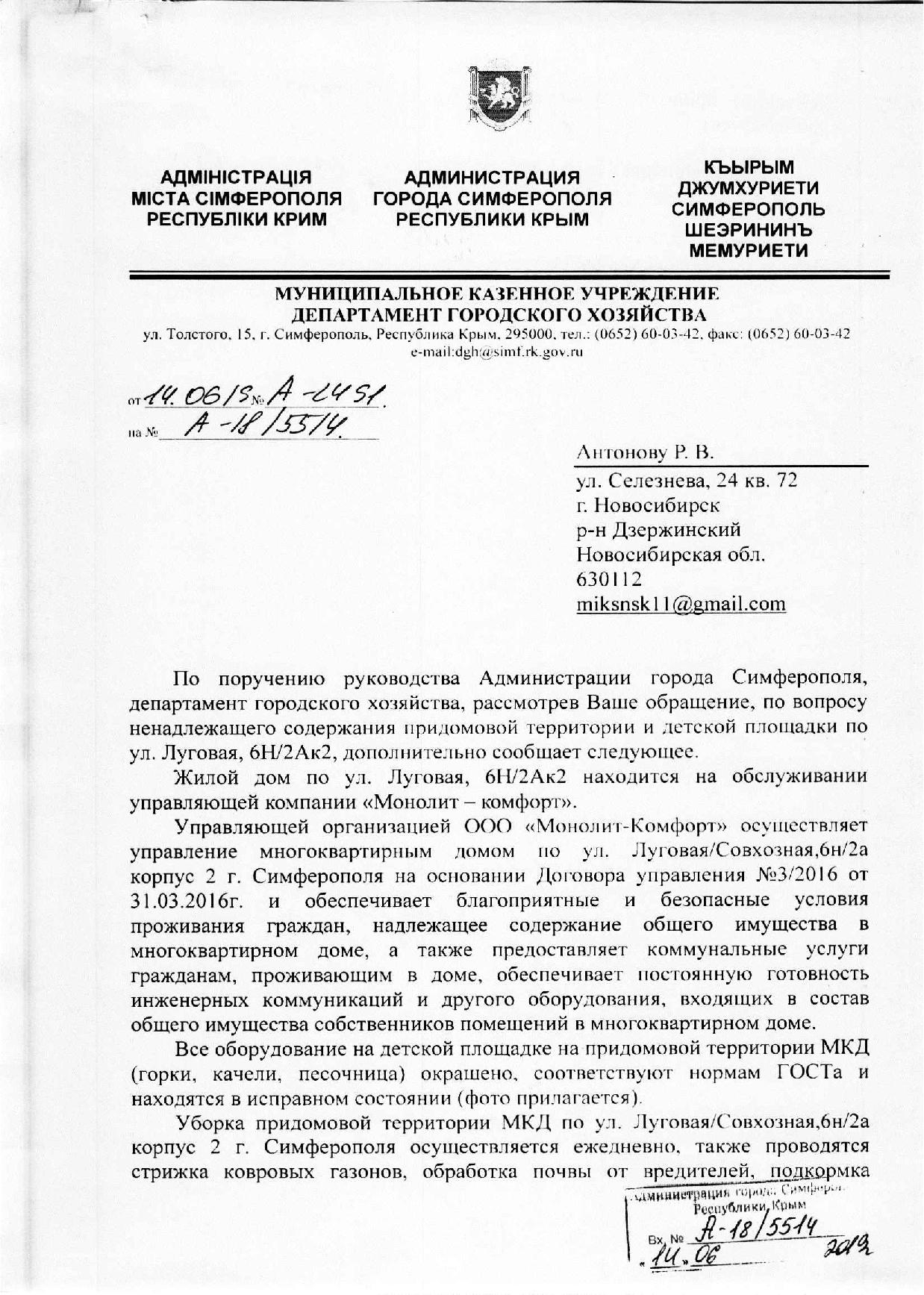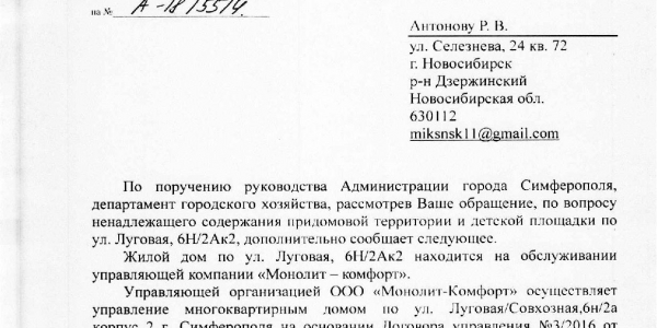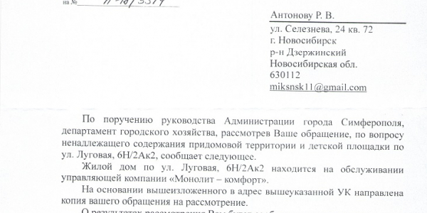 Номер жалобы:52389 Тип жалобы:Иные проблемы ЖКХ Название объекта: Регион:Республика Крым Город:Симферополь Адрес:Симферополь, Луговая улица, 6Н/2Ак1 Описание жалобы:К жалобе 49122