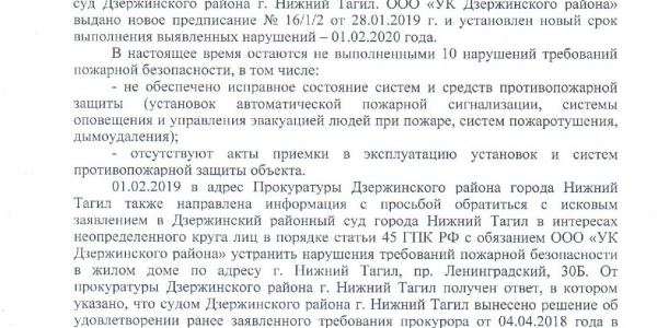 Номер жалобы:52433 Тип жалобы:Иные проблемы ЖКХ Название объекта: Регион:Свердловская область Город:Нижний Тагил Адрес:Ленинградский проспект, 30Б Описание жалобы:Требуем произвести проверку работоспособности системы пожаротушения. 4 года как дом сдан, а система не активна. Так же как и система дымоудаления. Управляющая компания всячески препятствует вводу в эксплуатацию вышеупомянутых систем. Мы хотим жить в безопасности. Статус: