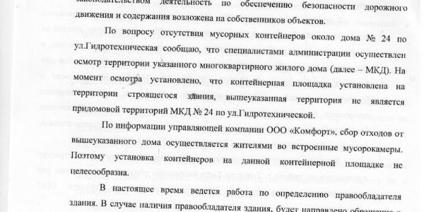 Номер жалобы:52284 Тип жалобы:Иные проблемы ЖКХ Название объекта: Регион:Самарская область Город:Тольятти Адрес:Гидротехническая, 24 Описание жалобы:Мусорных контейнеров нет! Ежедневный мусор везде! Звоним постоянно в УК, нас не слышат! Постоянно сваливают на других операторов по вывозу, то говорили то, что это их территория, но туда только крупный мусор можно выкидывать, а теперь это не к нам вопросы, к этому мы отношения не имеем. Скоро начнётся тепло, этот весь мусор повсюду начнёт гнить, вонять. За домом бегают дети! Статус: