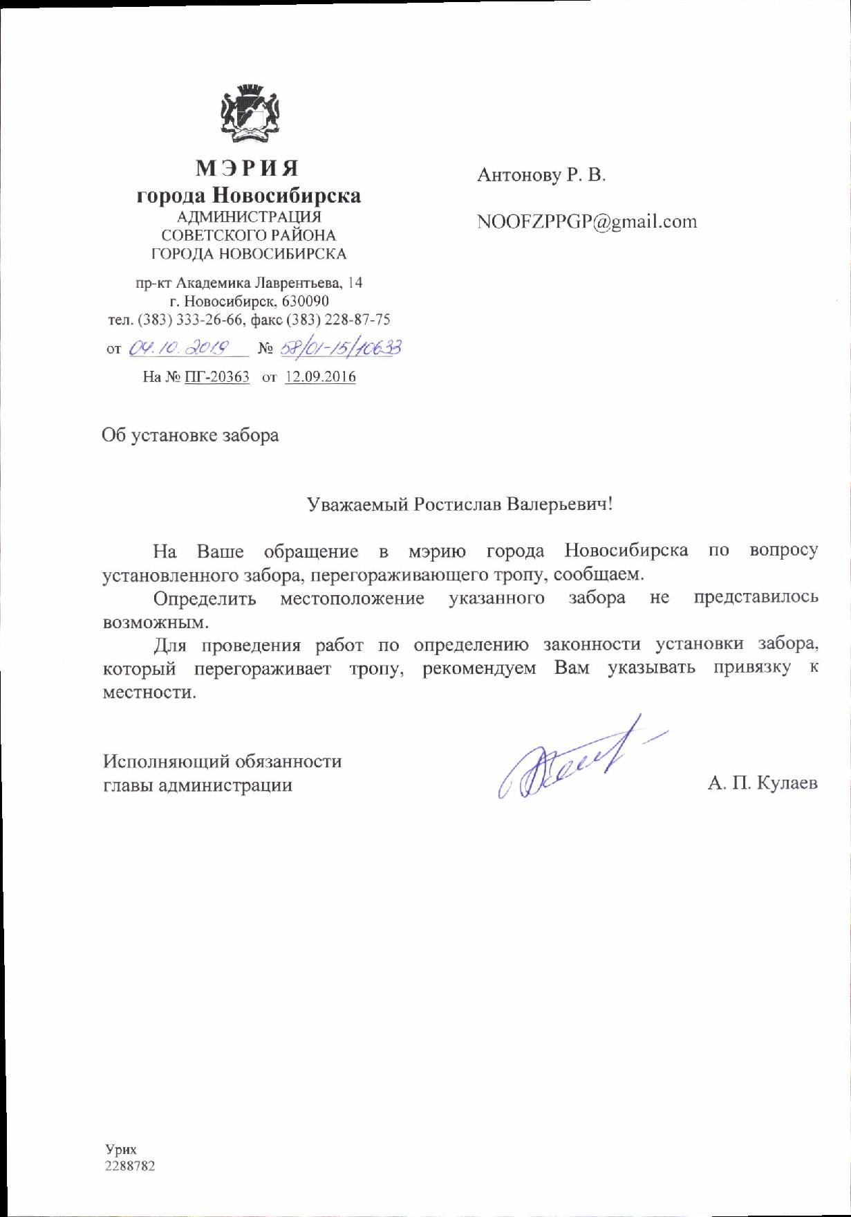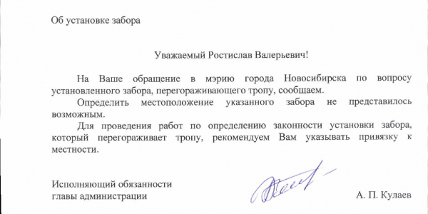 Номер жалобы:60124 Тип жалобы:Прочее Название объекта: Регион:Новосибирская область Город:Новосибирск Адрес:Советский район Описание жалобы:Перегородки ли тропу забором: вместе с полем огородили кусок леса и тропу - теперь приходится делать большой крюк. Просьба проверить законность Статус: