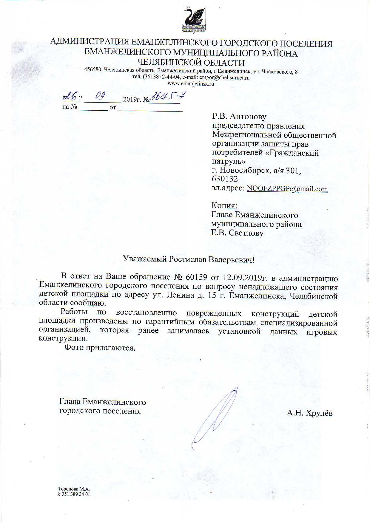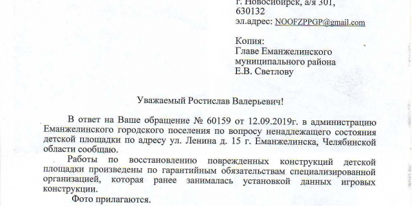 Номер жалобы:60159 Тип жалобы:Прочее Название объекта:Администрация г.Еманжелинск Регион:Челябинская область Город:Еманжелинск Адрес:улица Ленина, 15 Описание жалобы:Во дворе дома 15 по улице Ленина установлена детская площадка.