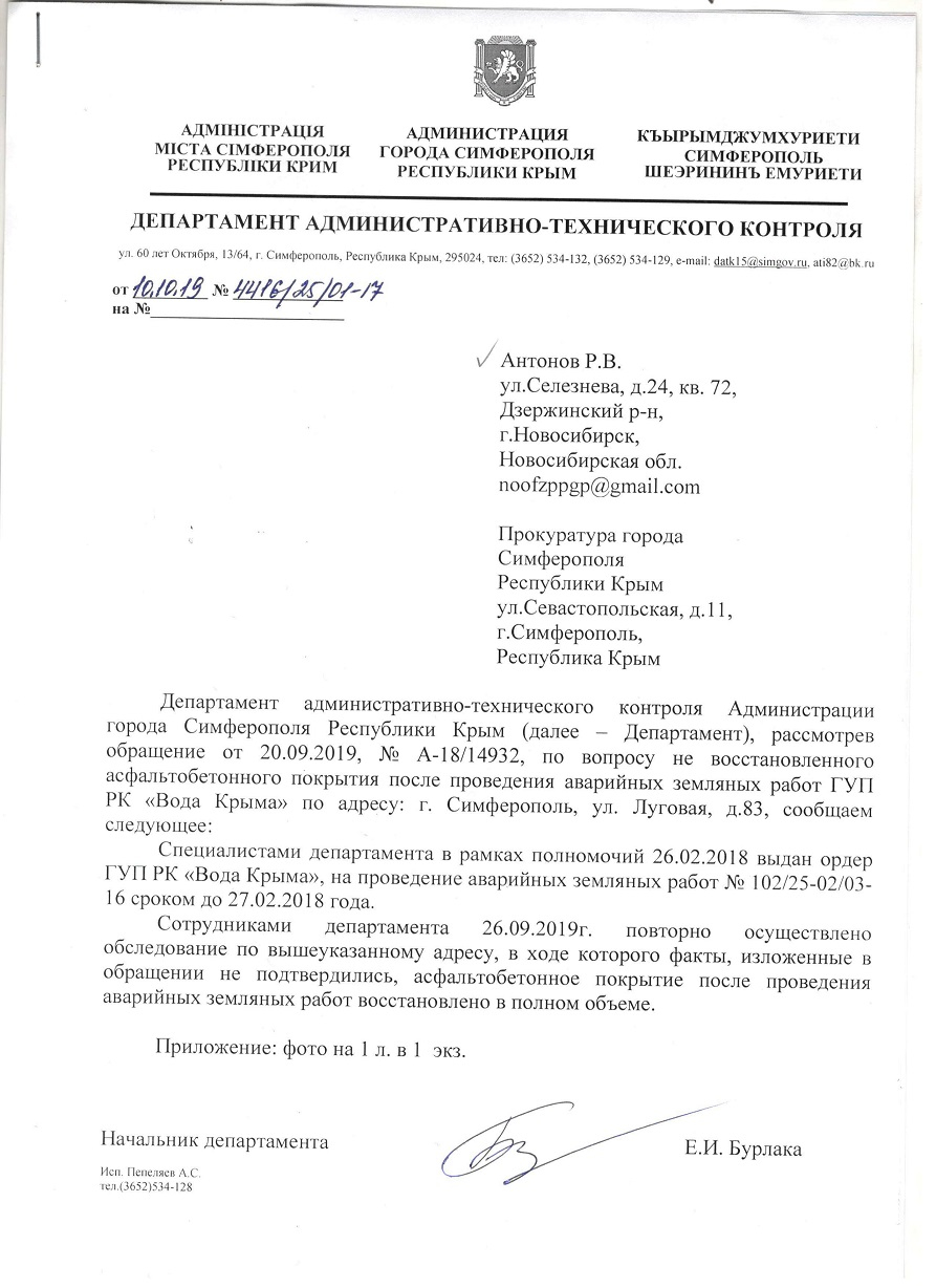 Номер жалобы:60142 Тип жалобы:Прочее Название объекта: Регион:Республика Крым Город:Симферополь Адрес:Луговая улица, 83 Описание жалобы:В прокуратуру на бездействие ГУП Вода крыма