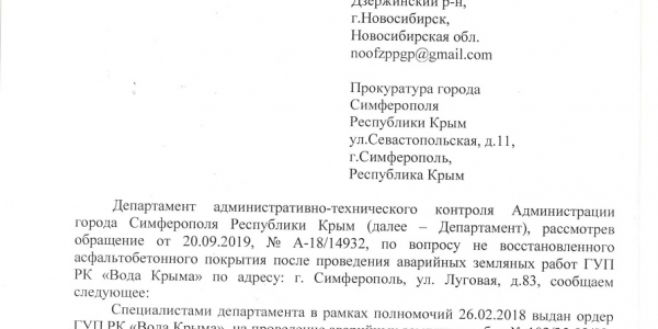 После раскопок во дворе жилого дома не восстановлен асфальт, администрация г. Симферополь выдавала предписание на устранение, но за 8 месяцев и 3 обращений яма не заделана Статус: