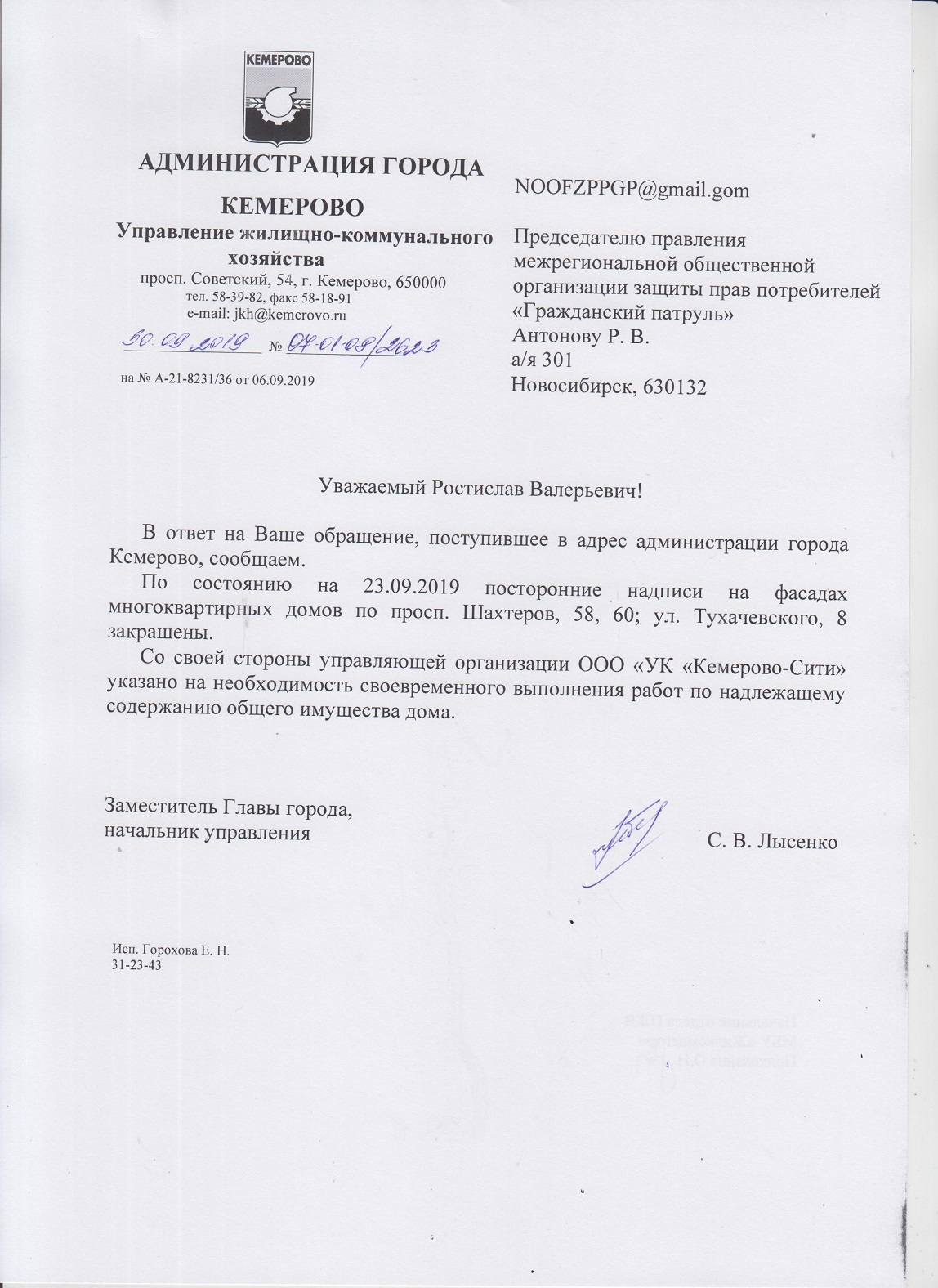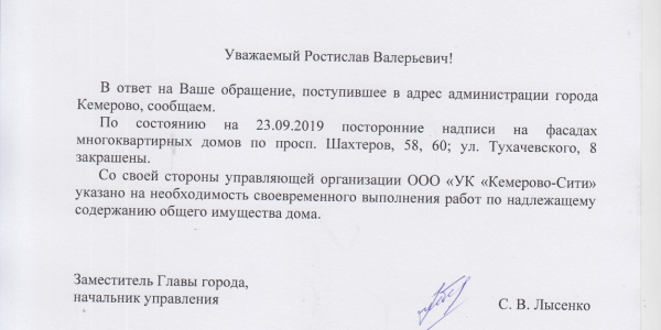Номер жалобы:59680 Тип жалобы:Прочее Название объекта: Регион:Кемеровская область Город:Кемерово Адрес:проспект Шахтёров, 58 Описание жалобы:Надписи на фасаде Статус: