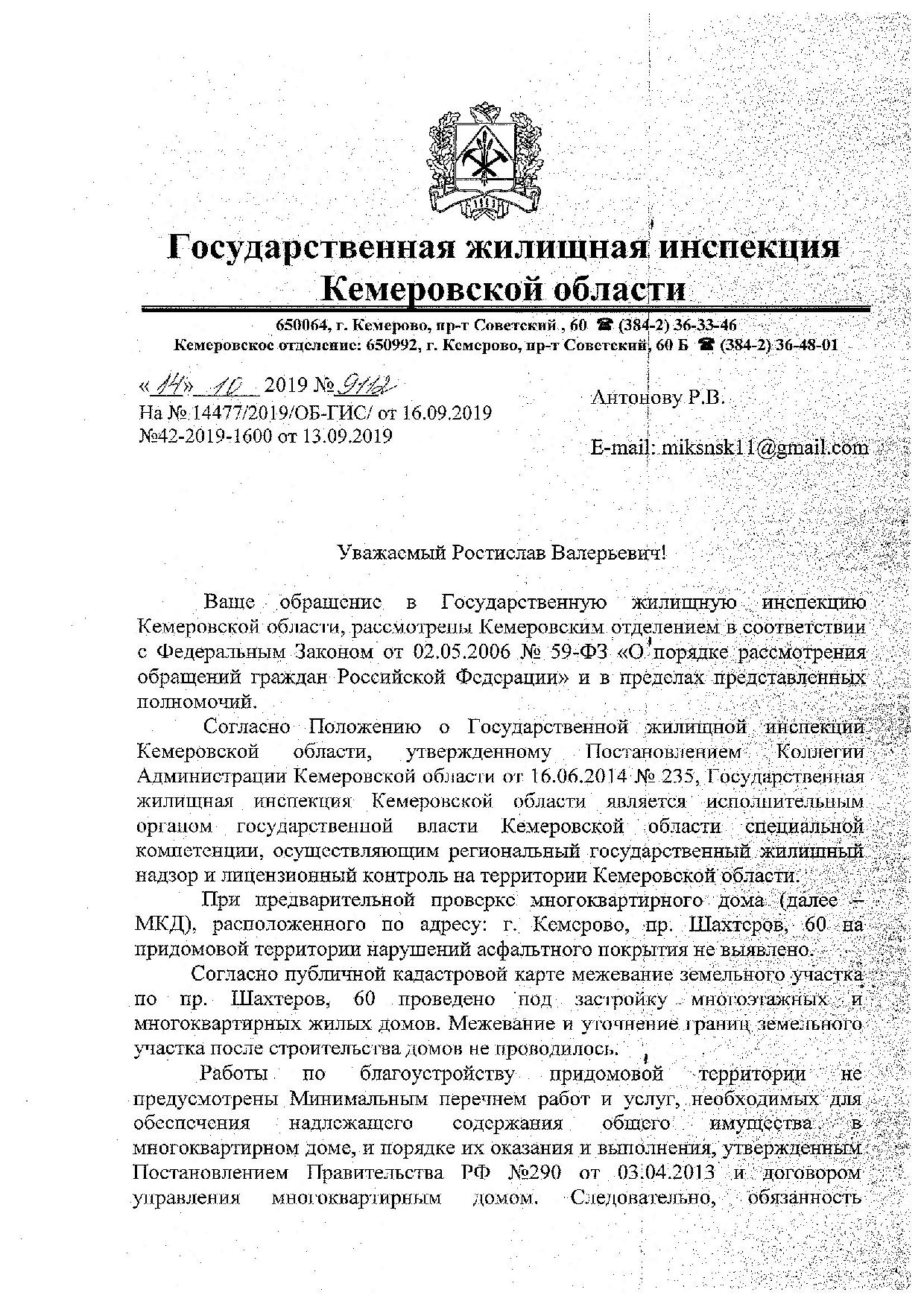 Номер жалобы:59682 Тип жалобы:Прочее Название объекта: Регион:Кемеровская область Город:Кемерово Адрес:проспект Шахтёров, 60 Описание жалобы:ГЖИ Тротуар во дворе Статус: