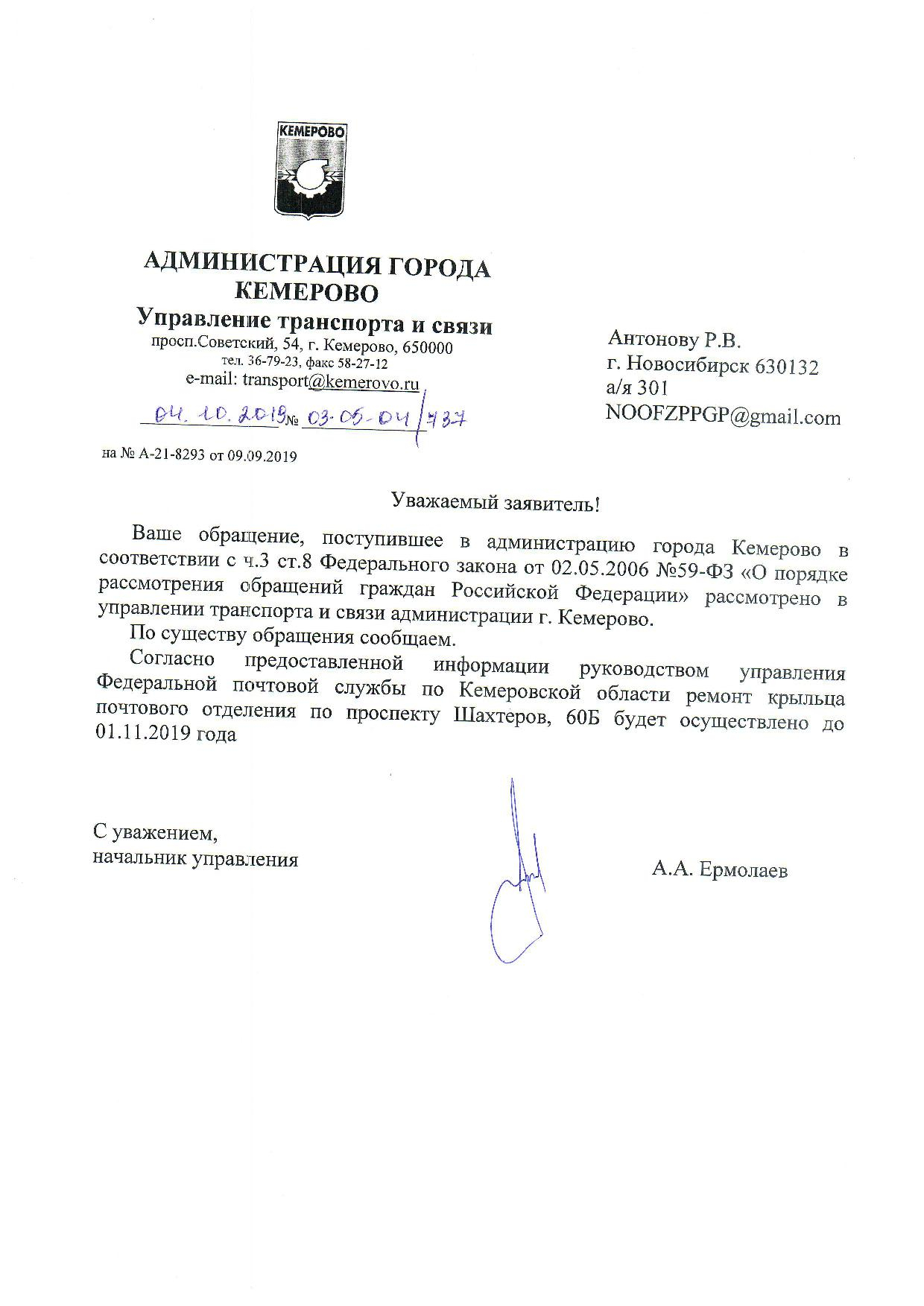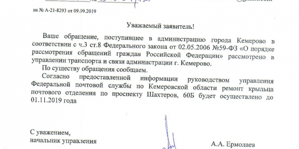 Номер жалобы:59683 Тип жалобы:Прочее Название объекта: Регион:Кемеровская область Город:Кемерово Адрес:проспект Шахтёров, 60Б Описание жалобы:Разрушения парапета крыльца почты Статус:
