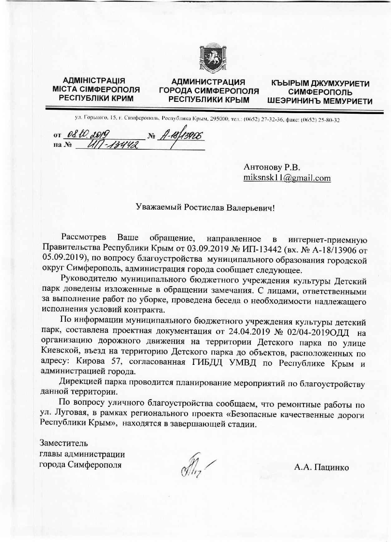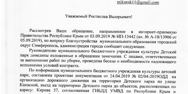 Номер жалобы:59510 Тип жалобы:Прочее Название объекта: Регион:Республика Крым Город:Симферополь Адрес:Симферополь, Детский парк Описание жалобы:В гибдд, Администрацию Симферополя.