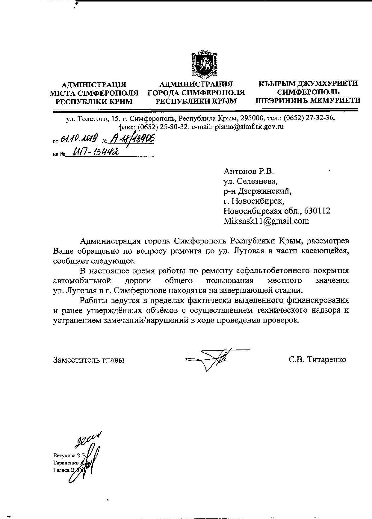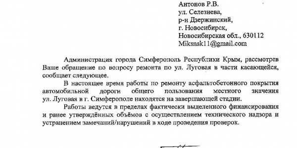 Номер жалобы:59517 Тип жалобы:Прочее Название объекта: Регион:Республика Крым Город:Симферополь Адрес:Симферополь, Луговая улица, 6 Описание жалобы:Ремонт улицы остановлен с 29августа, брошены недоделанные тротуары, нет ни одной единицы техники и ни одного человека. Прошу назвать сроки окончания ремонта тротуаров и дороги по ул. Луговой. Статус: