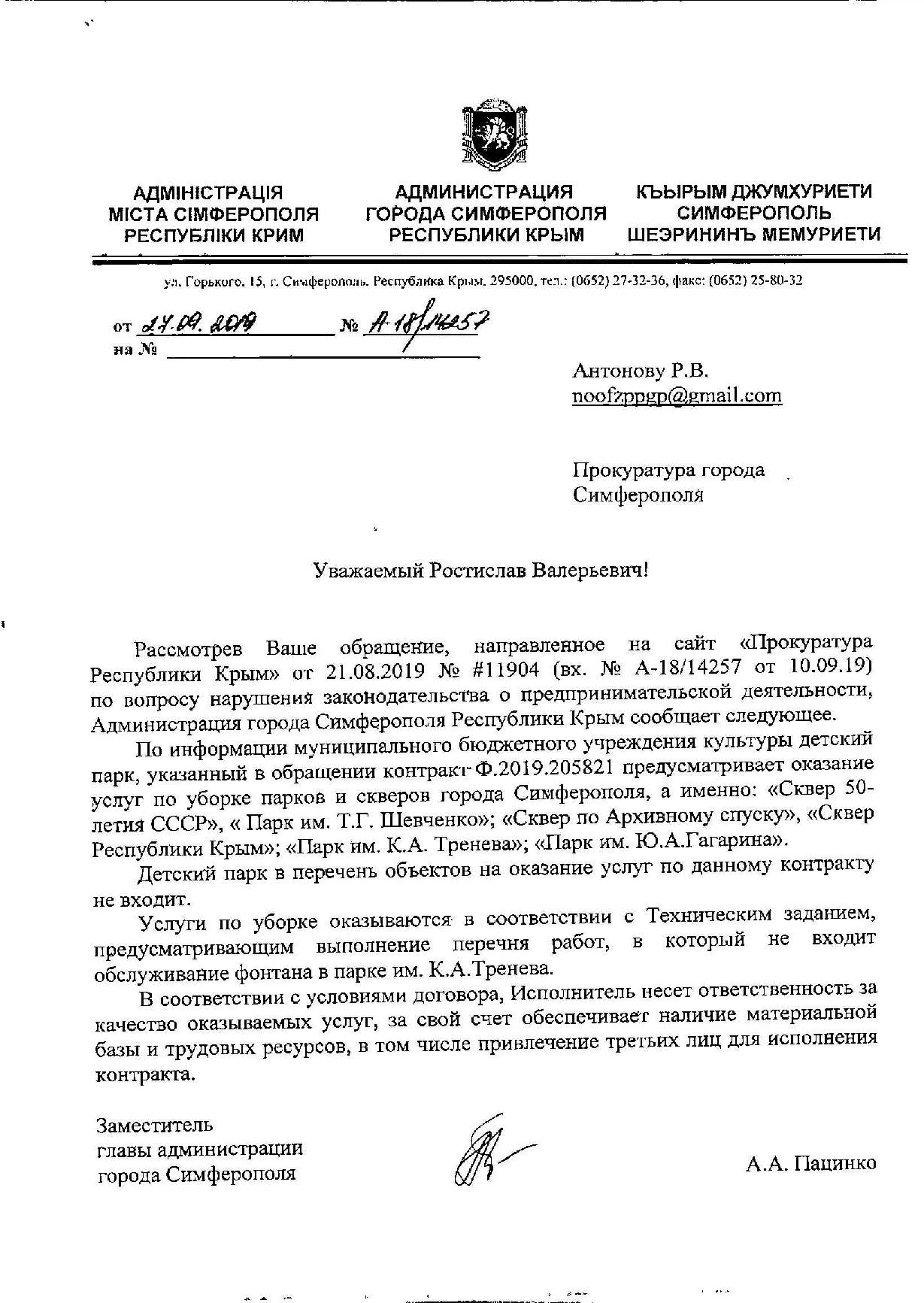 Номер жалобы:59509 Тип жалобы:Прочее Название объекта: Регион:Республика Крым Город:Симферополь Адрес:Симферополь, Детский парк Описание жалобы:В налоговую и роспотребнадзор: