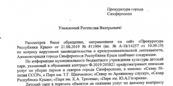 Номер жалобы:59507 Тип жалобы:Прочее Название объекта: Регион:Республика Крым Город:Симферополь Адрес:парк имени Юрия Гагарина Описание жалобы:Ненадлежащее исполнение госконтракта Ф.2019.205821 уборка территории парк им. Ю.А Гагарина- дорожки в парке грязные в слое птичьего помета, прошу провести помывку дорожек в парке. Статус: