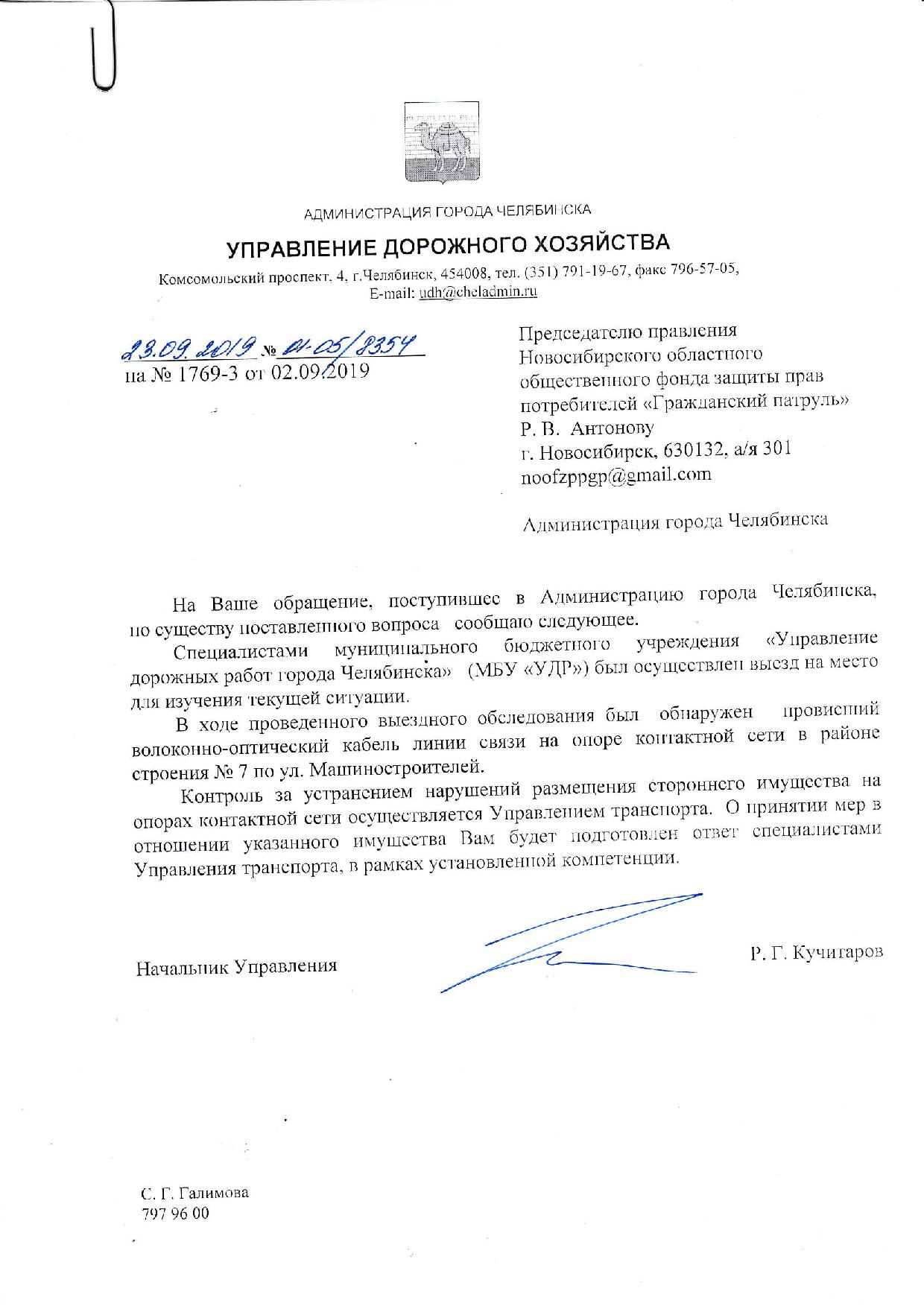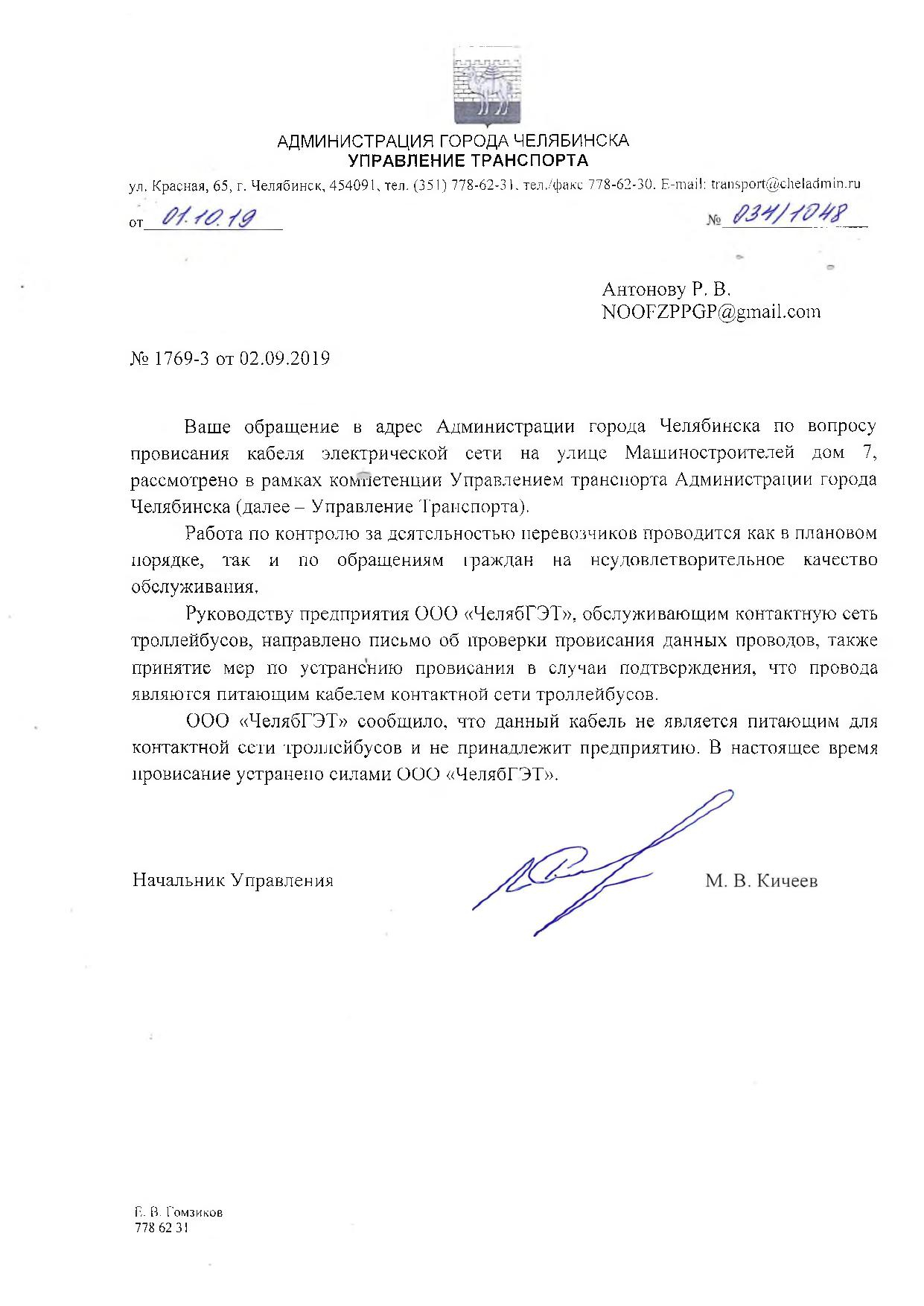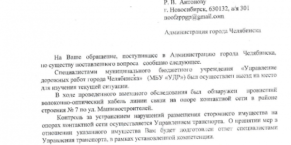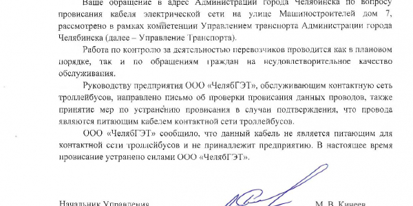 Номер жалобы:59453 Тип жалобы:Прочее Название объекта:Администрация г.Челябинска Регион:Челябинская область Город:Челябинск Адрес:улица Машиностроителей, 7 Описание жалобы:Над тротуаром напротив дома 7 по улице Машиностроителей провисает кабель электрической сети. Второй конец кабеля находится на газоне. Прошу принять меры. Статус: