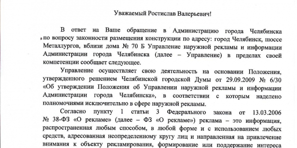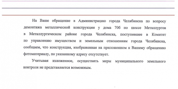 Номер жалобы:59226 Тип жалобы:Прочее Название объекта: Регион:Челябинская область Город:Челябинск Адрес:шоссе Металлургов, 70б Описание жалобы:Ранее данная конструкция, которая находится перед ДК "Строитель" (ш. Металлургов, 70б), использовалась для рекламы фильмов в кинотеатре "Россия", но в 2015 г. кинотеатр закрылся. На данный момент конструкция не эксплуатируется, а только портит вид города. Прошу её демонтировать. Статус: