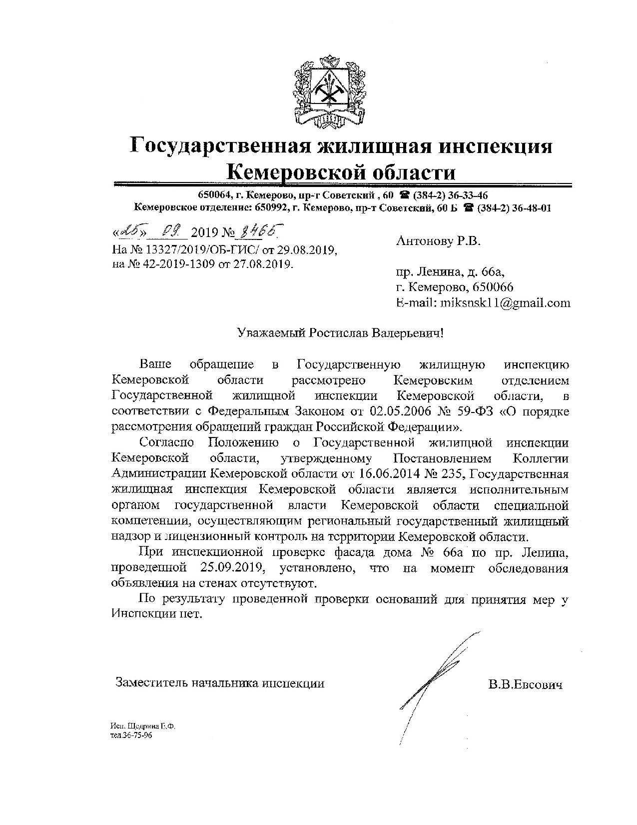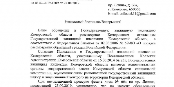 Номер жалобы:58905 Тип жалобы:Прочее Название объекта: Регион:Кемеровская область Город:Кемерово Адрес:проспект Ленина, 66А Описание жалобы:ГЖИ Стены и подъезд нуждаются к косметическом ремонте Статус: