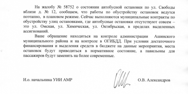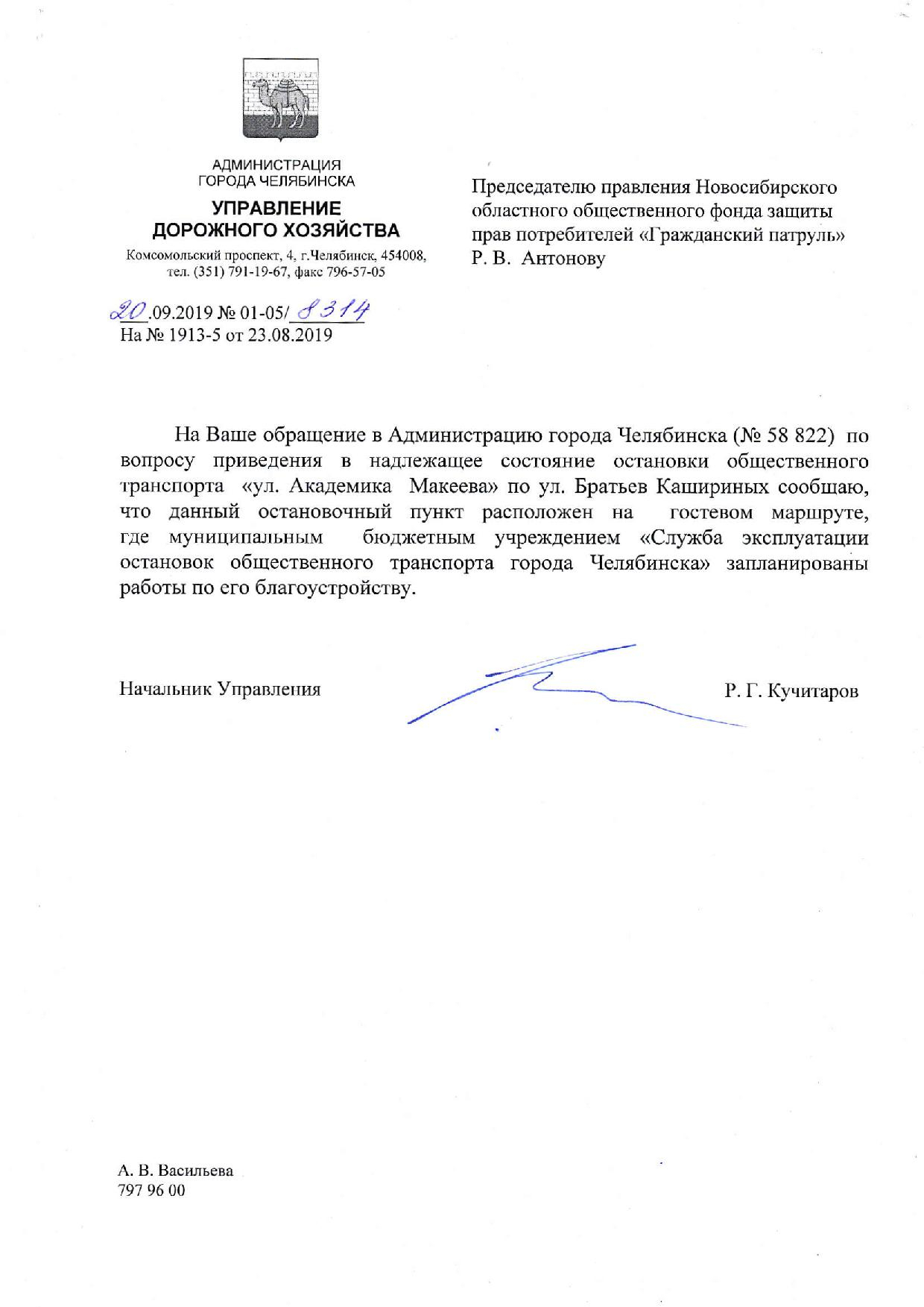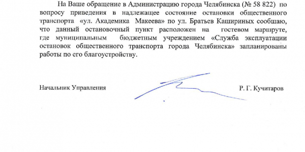 Номер жалобы:58822 Тип жалобы:Прочее Название объекта:Администрация Калининского района г.Челябинска Регион:Челябинская область Город:Челябинск Адрес:Остановка ул.Ак.Макеева Описание жалобы:Остановка ул.Ак.Макеева (расположенная по улице Бр.Кашириных, в сторону Северо-Запада).