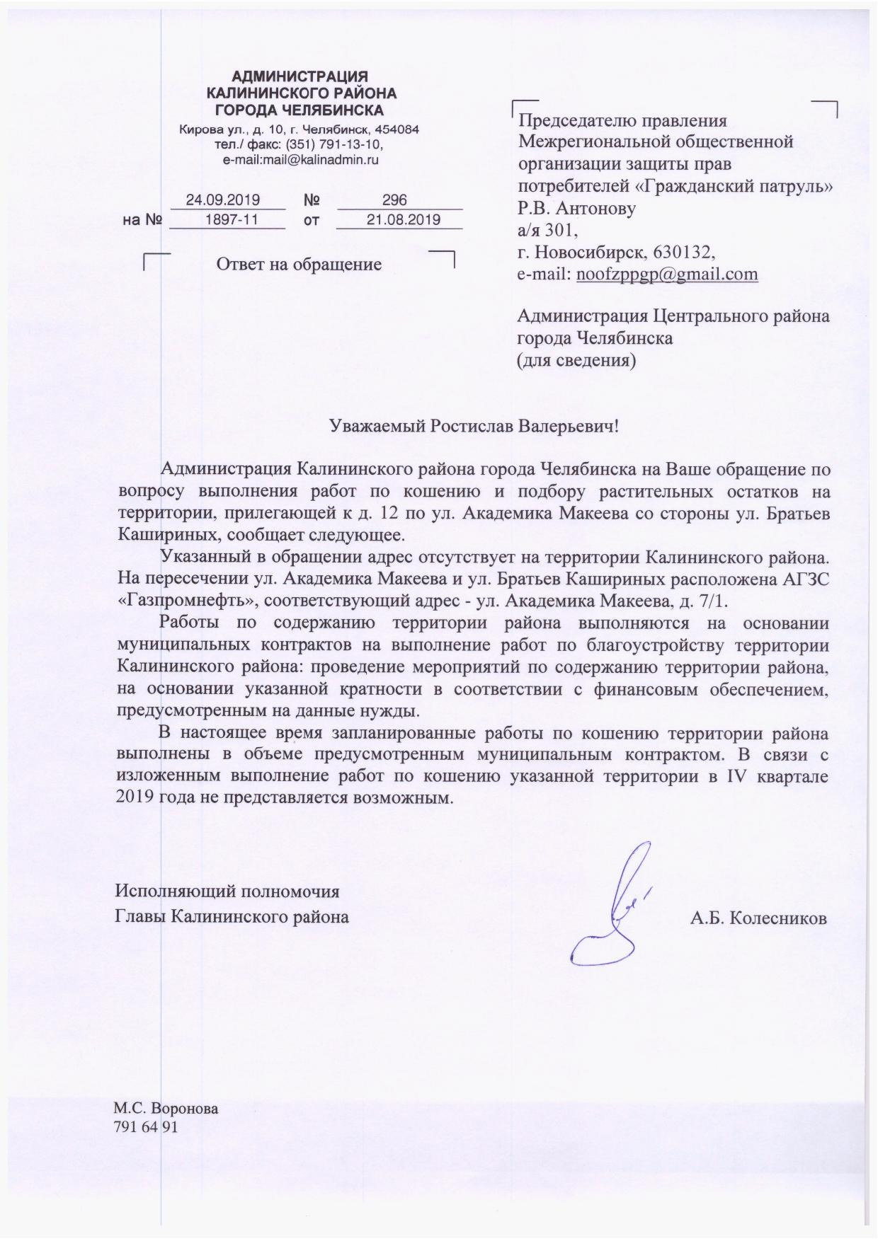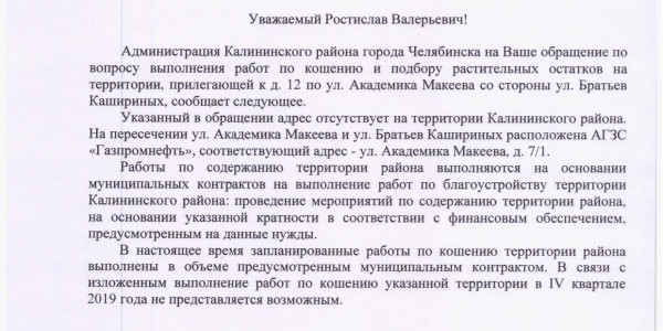 Номер жалобы:58824 Тип жалобы:Прочее Название объекта:Администрация Калиниского района г.Челябинска Регион:Челябинская область Город:Челябинск Адрес:улица Академика Макеева, 12 Описание жалобы:1897-11 На территории, которая прилегает к АЗС Газпром (ул.Ак.Макеева 12) со стороны ул. Братьев Кашириных не скошена трава, трава по пояс, репьи.