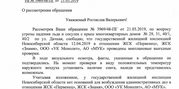 Номер жалобы:51254 Тип жалобы:Иные проблемы ЖКХ Название объекта: Регион:Новосибирская область Город:Новосибирск Адрес:Дачная улица, 29 Описание жалобы:Сосульки на крыше дома Статус: