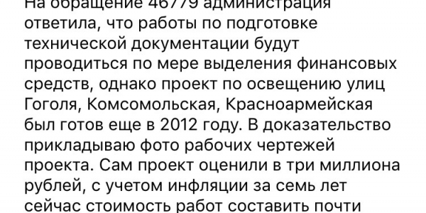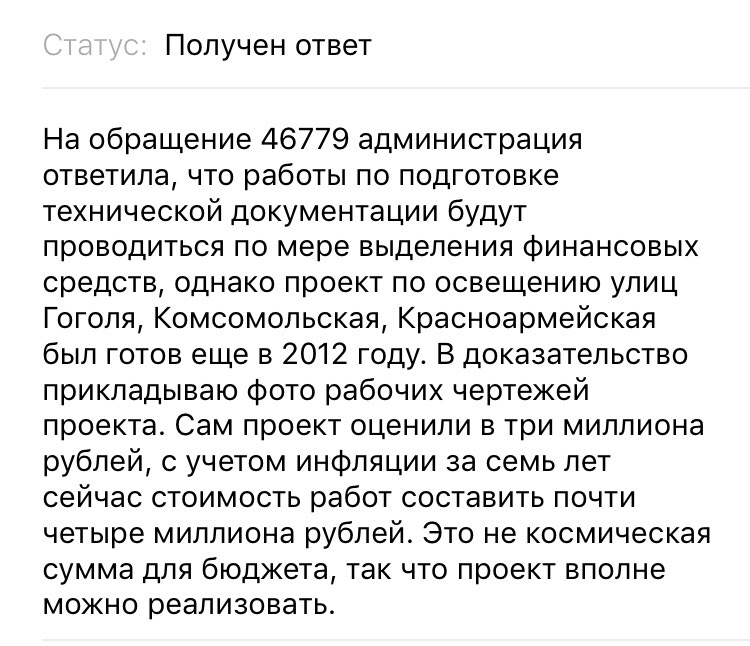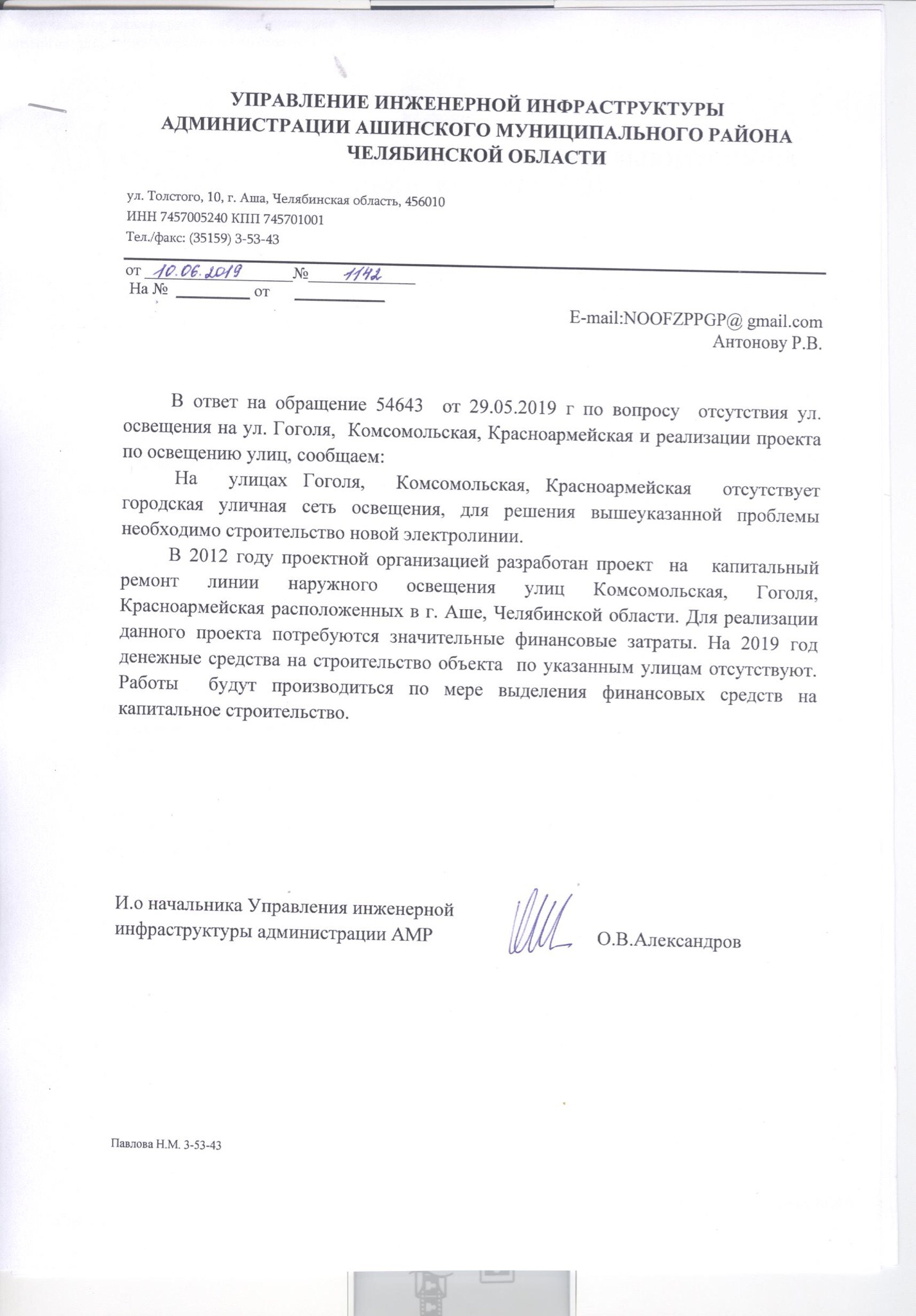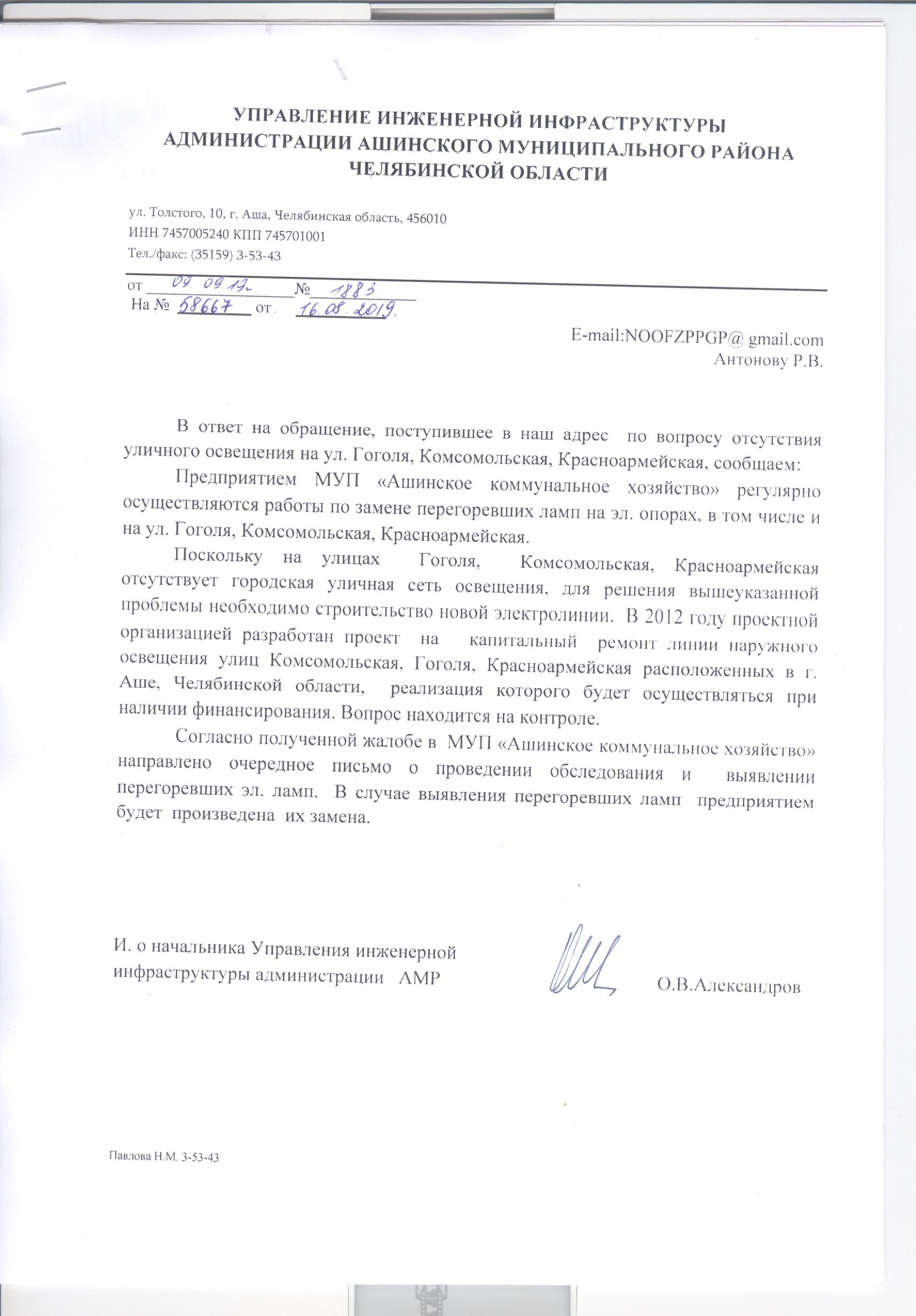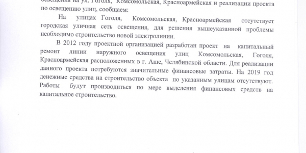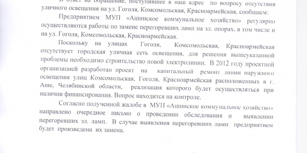 На основании изложенного, прошу обязать МУП "Ашинское коммунальное хозяйство" восстановить освещение на существующих опорах на ул. Гоголя, Комсомольская и Красноармейская в соответствии с ГОСТ Р 55706-2013 «Освещение наружное утилитарное», а так же включить в план работ на 2020г. проект на капитальный ремонт линии наружного освещения улиц Гоголя, Комсомольская, Красноармейская от 2012 г.
