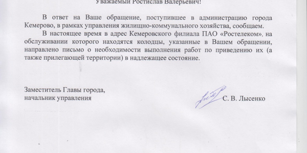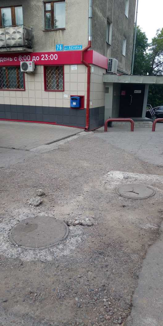Номер жалобы:58677 Тип жалобы:Прочее Название объекта: Регион:Кемеровская область Город:Кемерово Адрес:проспект Ленина, 76 Описание жалобы:На углу дома, где паркуются машины, со стороны проезда перед домом имеются разрушения асфальта вокруг колодцев. Также одна из крышек имеет трещины и уже прогнулась внутрь. Это может привести к трагедии. Либо машина провалится, либо прохожие. Это часть тротуара Статус: