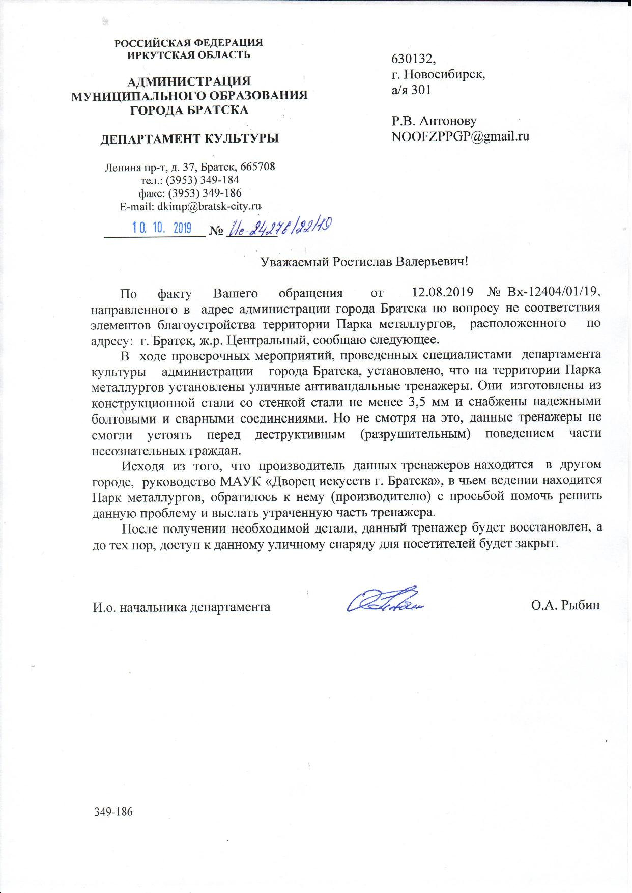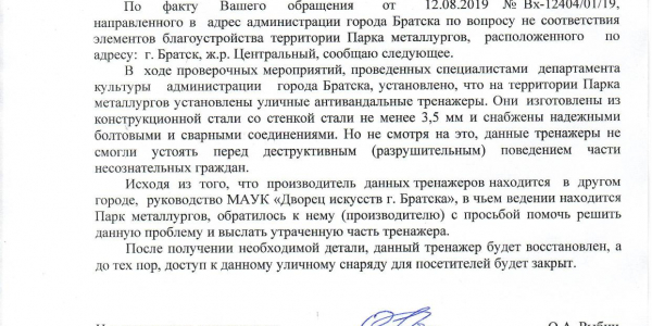 Номер жалобы:58492 Тип жалобы:Прочее Название объекта: Регион:Иркутская область Город:Братск Адрес:Братск, 5-й микрорайон Описание жалобы:Парк Металлургов, как и пошла заявка. Тренажёр не имеет положенной спинки, опасен для занятий Статус:
