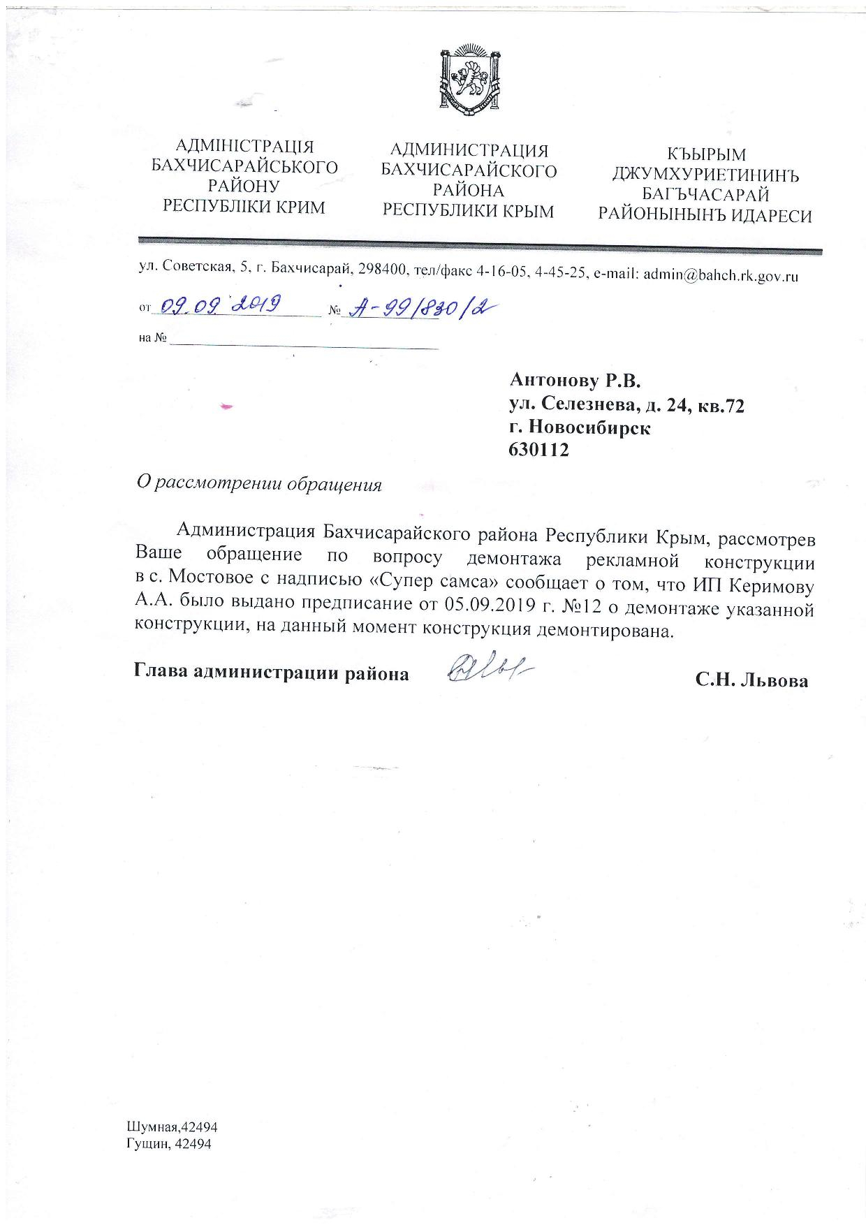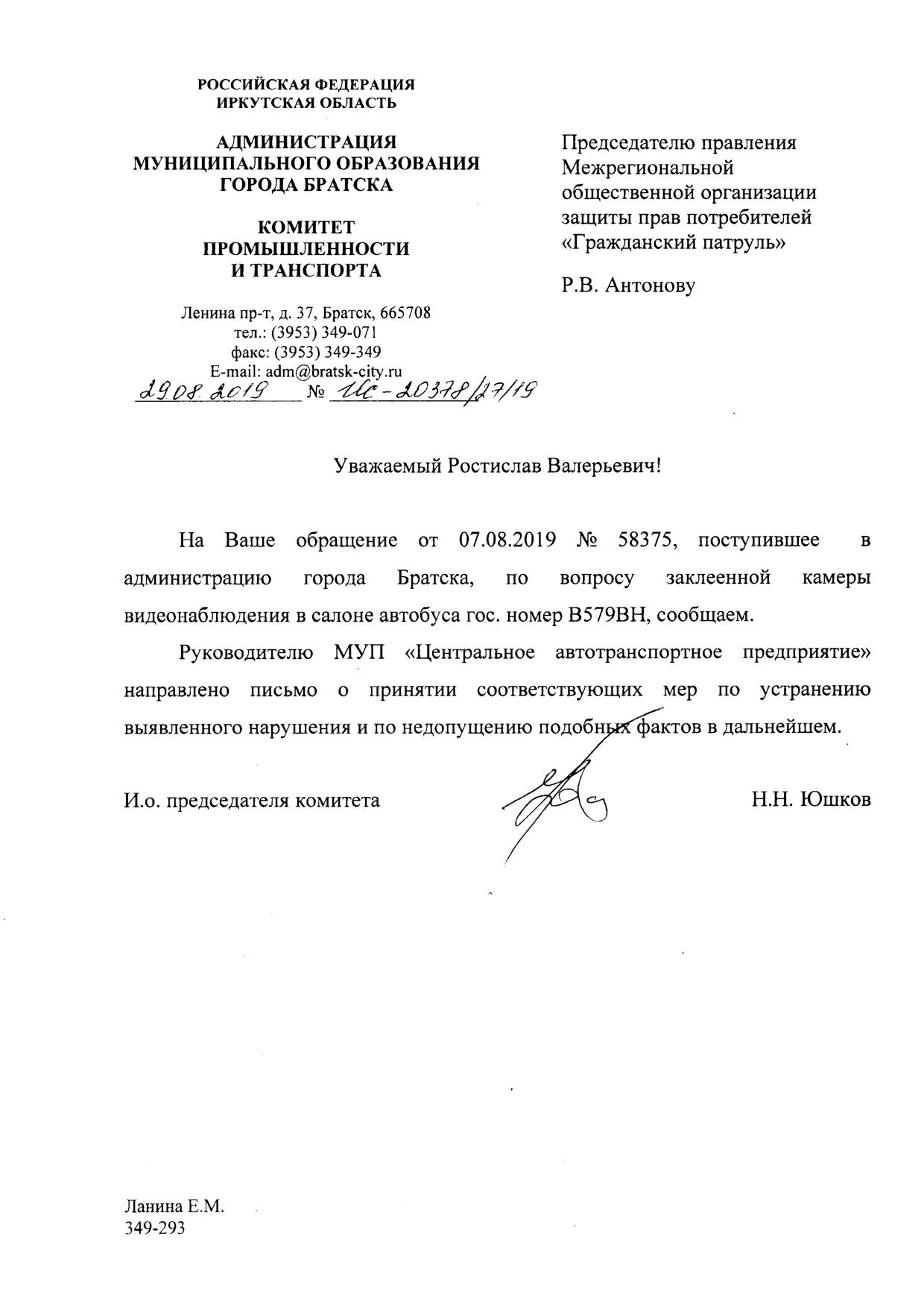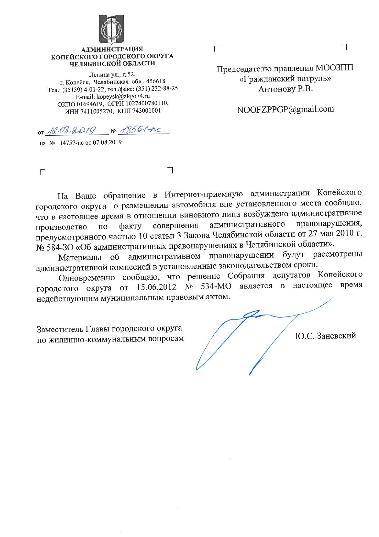 В ответ на Ваше письмо исх. номер А-40/5053/2 от 18.07.2019 г. сообщаю, что все обращения граждан, поданные в межрегегиональную общественную организацию защиты прав потребителей " Гражданский патруль" направляются от имени руководителя Антонова Р.В. Основной целью организации является общественный контроль за соблюдением законов органов гос. власти, гос. и муниципальных организаций.
