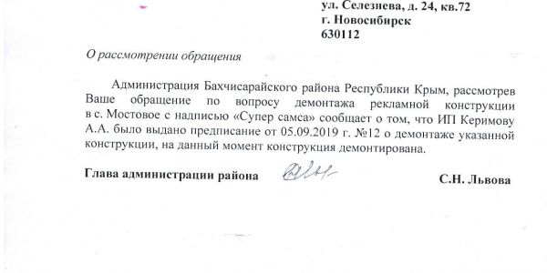 2. Размещена незаконный рекламный баннер с надписью "Супер самса" в 100-300 м от кафе на обочине дороги, прошу демонтировать. Статус: