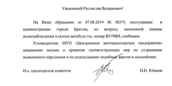 Номер жалобы:58375 Тип жалобы:Прочее Название объекта: Регион:Иркутская область Город:Братск Адрес:(56.147200, 101.61361) Описание жалобы:Камера, следящая за водителем автобуса заклеена. Гос. номер В579ВН 38RUS Статус: