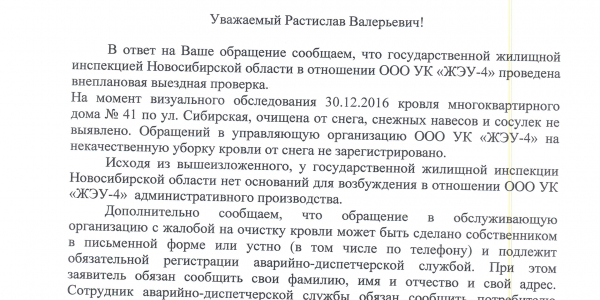 Номер жалобы:12085 Тип жалобы:Качество уборки снега во дворе Название объекта:Управляющая Компания Город:Новосибирск Адрес:Новосибирск, улица Сибирская, 41 Описание жалобы:Снег может скатиться Статус: