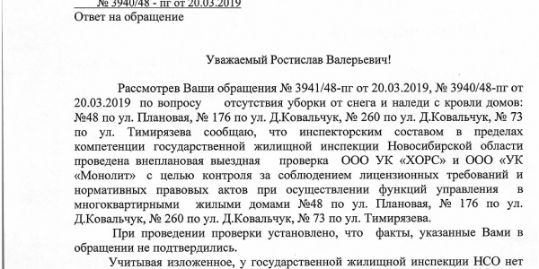 Номер жалобы:51113 Тип жалобы:Иные проблемы ЖКХ Название объекта: Регион:Новосибирская область Город:Новосибирск Адрес:улица Жуковского, 119 Описание жалобы: Снег на крыше козырька Статус: