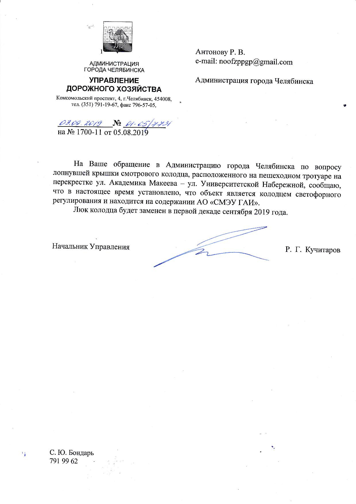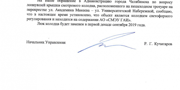 Номер жалобы:57994 Тип жалобы:Прочее Название объекта:Администрация Калининского района г.Челябинска Регион:Челябинская область Город:Челябинск Адрес:улица Университетская Набережная Описание жалобы:На тротуаре, расположенном на пересечении улиц Макеева и Ун.Набережная имеется канализационный люк. Поверхность люка лопнута. Люк несет угрозу здоровью и жизни жителей.