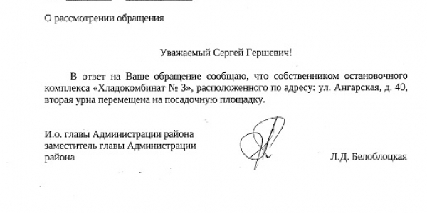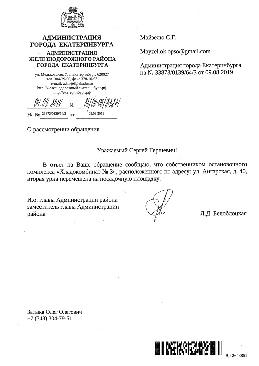 Номер жалобы:58016 Тип жалобы:Прочее Название объекта:мэрия Регион:Свердловская область Город:Екатеринбург Адрес:Билимбаевская улица, 36 Описание жалобы:На остановке «Хладокомбинат № 3» (на улице Билимбаевской в направлении центра) одна из двух урн установлена за навесом таким образом, что подойти к ней возможно только по газону. Необходимо её переставить на посадочную площадку. Статус: