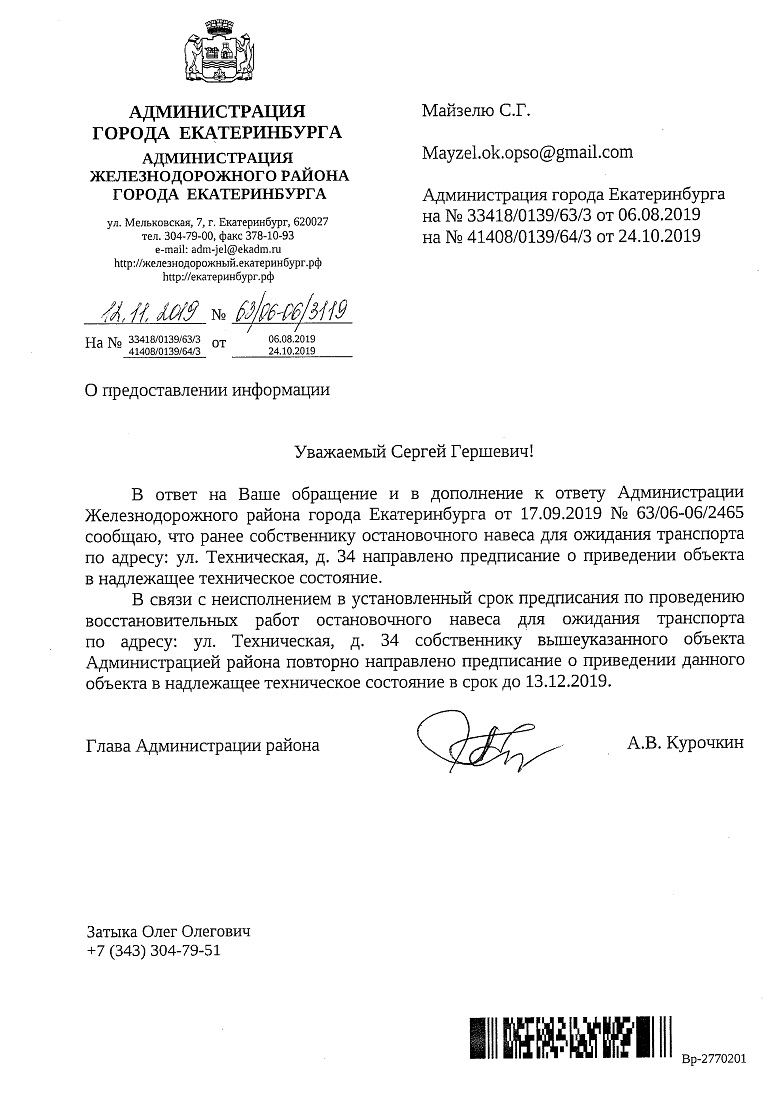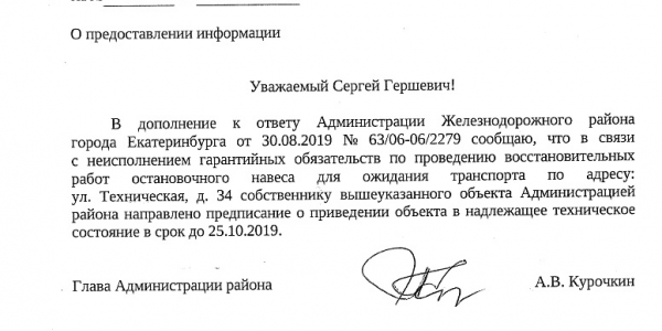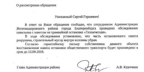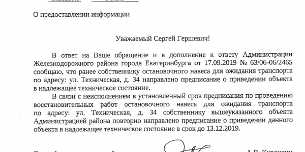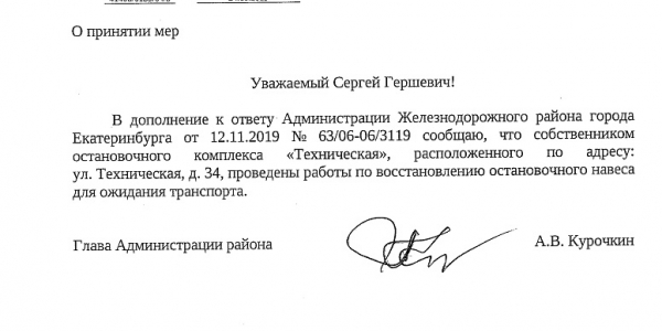 Номер жалобы:58023 Тип жалобы:Прочее Название объекта:мэрия Регион:Свердловская область Город:Екатеринбург Адрес:Техническая улица, 34 Описание жалобы:На навесе на трамвайной остановке «Техническая» в направлении центра отсутствует название остановки. Скамейка под навесом установлена на высоте 0,7 м, что затрудняет сидение на ней. Статус: