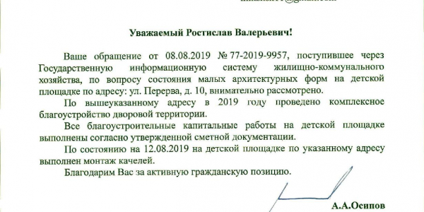 Номер жалобы:58004 Тип жалобы:Прочее Название объекта: Регион:Москва Город:Москва Адрес:улица Перерва, 10 Описание жалобы:Сделали новую площадку во дворе более 7 дней, качели досих пор не повесили Статус: