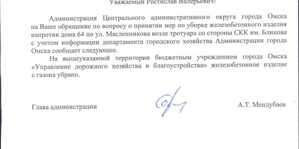 Номер жалобы:58038 Тип жалобы:Прочее Название объекта: Регион:Омская область Город:Омск Адрес:улица Масленникова, 64 Описание жалобы:Напротив дома 64 возле тротуара, со стороны СКК им. Блинова лежит жби изделие. Статус: