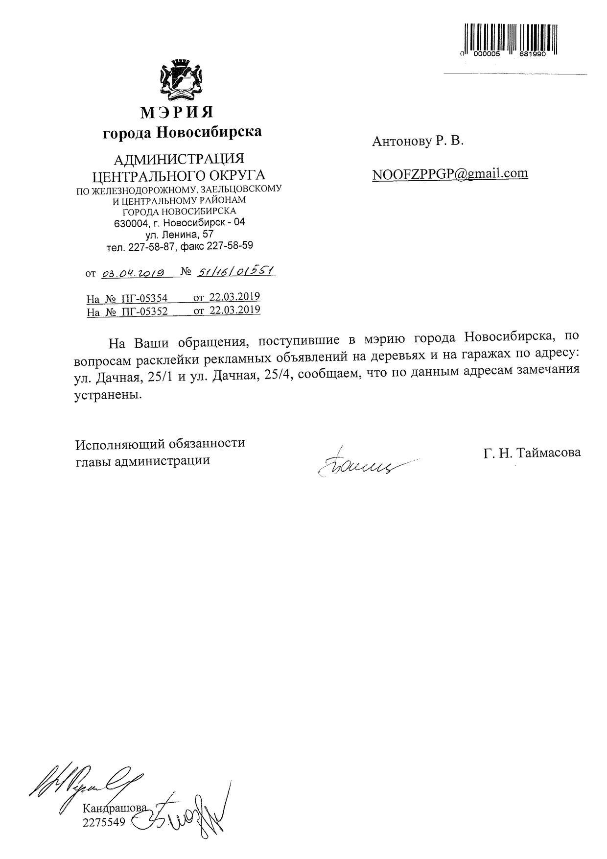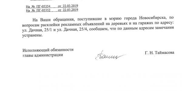 Номер жалобы:51078 Тип жалобы:Иные проблемы ЖКХ Название объекта: Регион:Новосибирская область Город:Новосибирск Адрес:Дачная улица, 25/4 Описание жалобы:Объявления на гараже Статус: