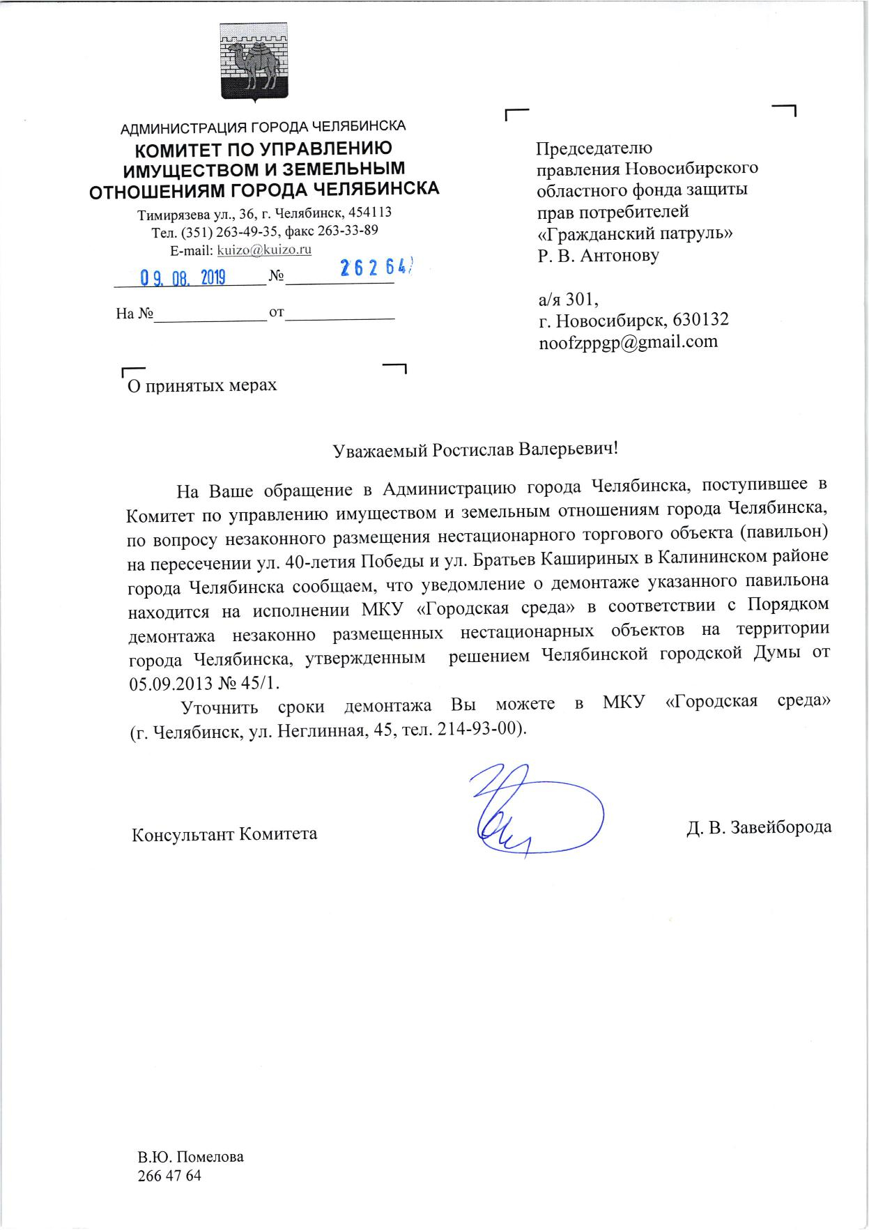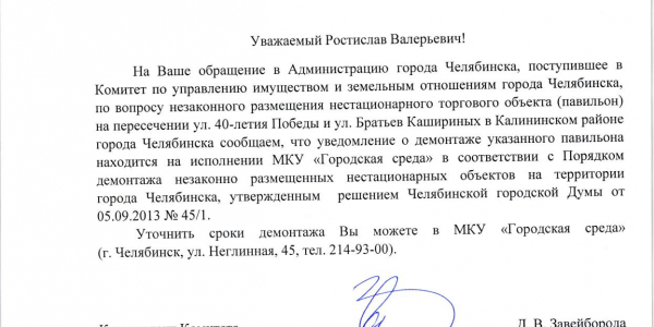 Номер жалобы:57441 Тип жалобы:Прочее Название объекта: Регион:Челябинская область Город:Челябинск Адрес:улица 40-летия Победы Описание жалобы:Можно узнать законно ли размещение данного ларька, на перекрестке 40-летия Победы и Братьев Кашириных Статус: